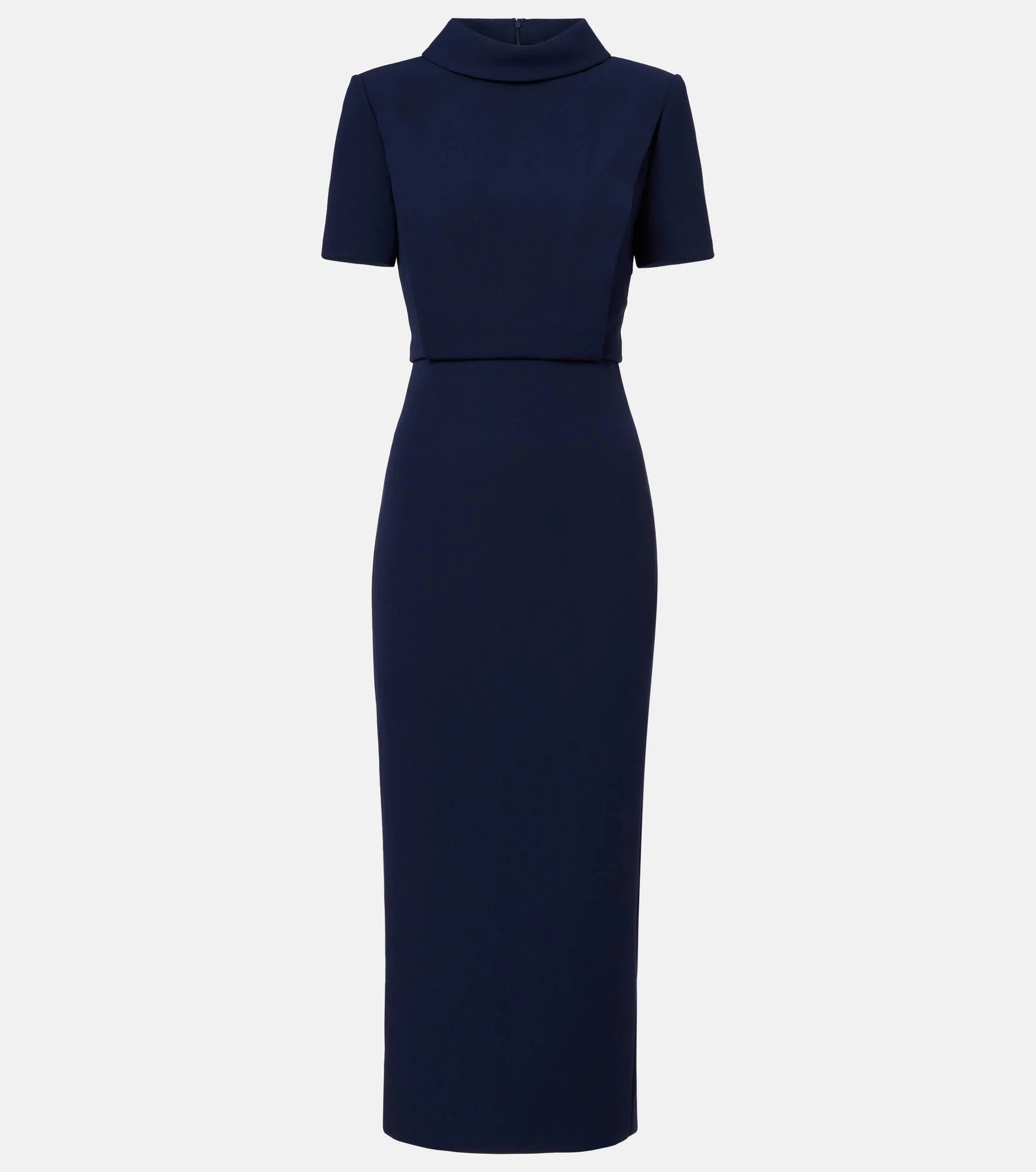 Roland Mouret has made its name through expertly crafted, timeless designs. This midi dress is crafted from cady with a high-neck collar. Product Details - Material: 60% acetate, 40% polyester - Care instructions: dry clean - Made in China - Designer color name: Navy - Item color: blue - Lining: 100% polyester - Closure: zipped back - Short vent - Item number: P01060421 Size & Fit - True to size - Shoulder pad inserts - Cinched waist - Slightly stretchy fabric - slit length 29,0cm-11.5" - The model seen in the picture is 178cm-5'10" and wearing a size UK 8