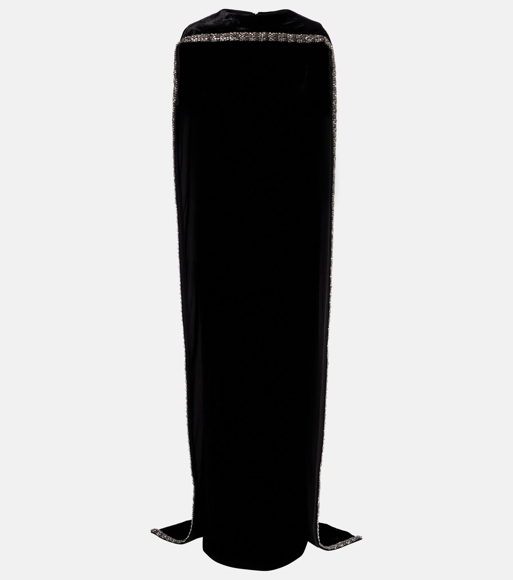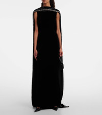 Made for grand entrances, this gown by Roland Mouret is crafted from velvet with a shimmering embellished detail at the front. The design is enhanced with a long cape and finished with a discreet closure. Product Details - Material: 79% viscose, 19% silk, 2% elastane - Care instructions: dry clean - Made in China - Designer color name: Black - Item color: black - Hardware color: silver - Lining: 100% polyester - Closure: concealed closure, hook fastening - Item number: P01104678 Size & Fit - True to size - Fitted - Loose outer layer - Non-stretchy fabric - The model seen in the picture is 178cm-5'10" and wearing a size UK 6