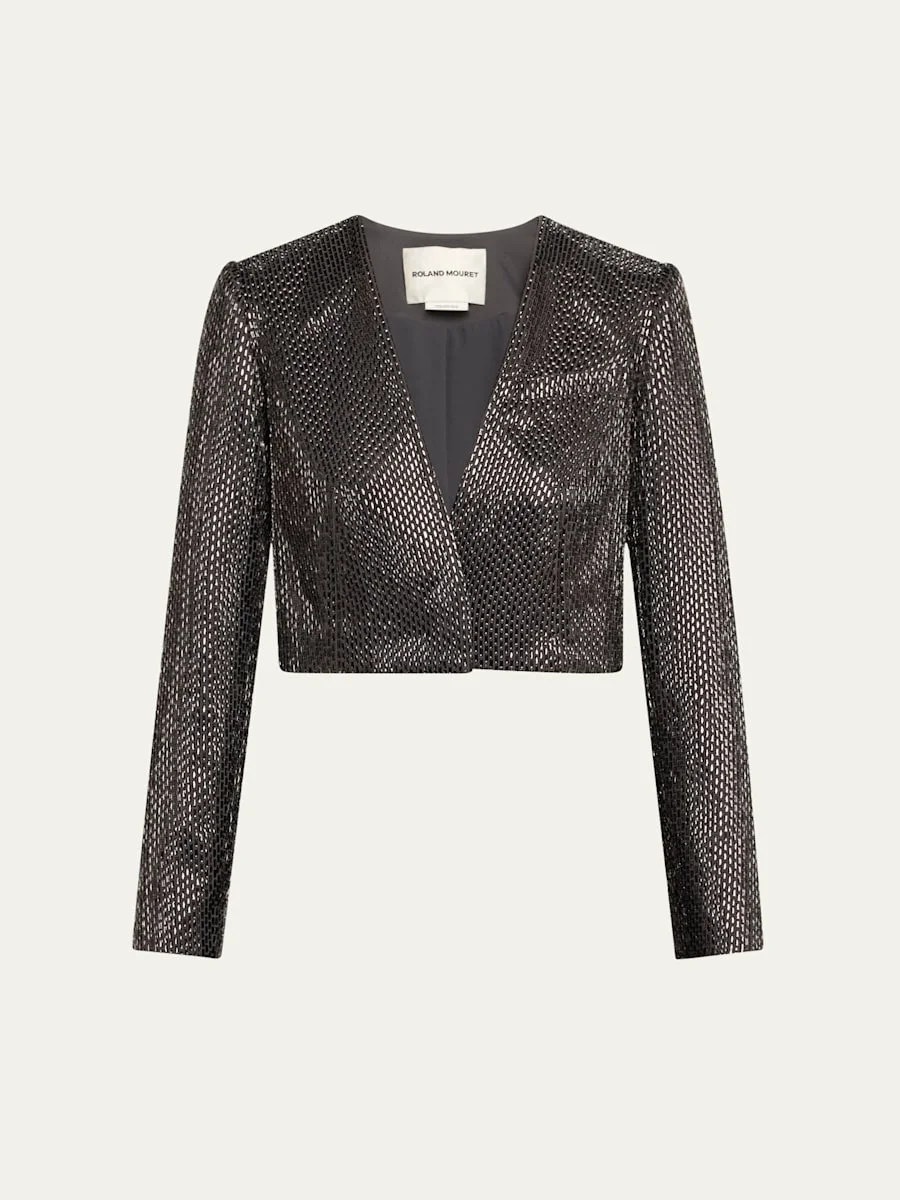 Roland Mouret crepe bolero jacket embellished with diamante V neckline; single-breasted front Long sleeves Padded shoulders Chest welt pocket Straight fit Cropped length Button closure Polyester/viscose/spandex Lining: Polyester Dry clean Imported Online Inquiries: BGS21_BAA9N| Store Inquiries: #5066994