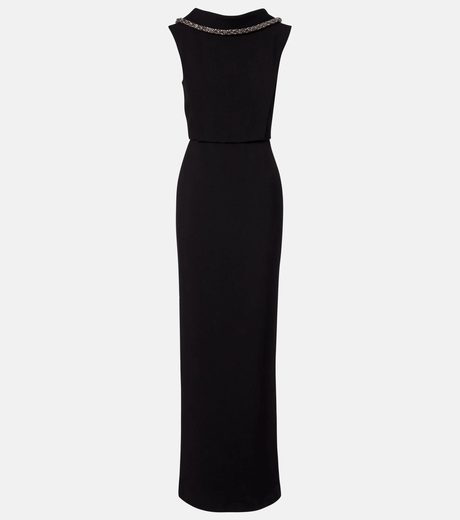 Renowned for precision tailoring and sculptural silhouettes, Roland Mouret brings timeless sophistication to modern dressing. Crafted from crepe, this sleeveless gown features an embellished detail at the neckline, a concealed zip and hook closure. Product Details - Material: 86% polyester, 10% viscose, 4% elastane - Care instructions: dry clean - Made in China - Designer color name: Black - Item color: black - Lining: 100% polyester - Hardware color: silver - Closure: concealed zipped back, hook-fastening back - Long vent - Item number: P01104675 Size & Fit - True to size - Cinched waist - Non-stretchy fabric - slit length 70cm-27.5" - The model seen in the picture is 178cm-5'10" and wearing a size UK 6