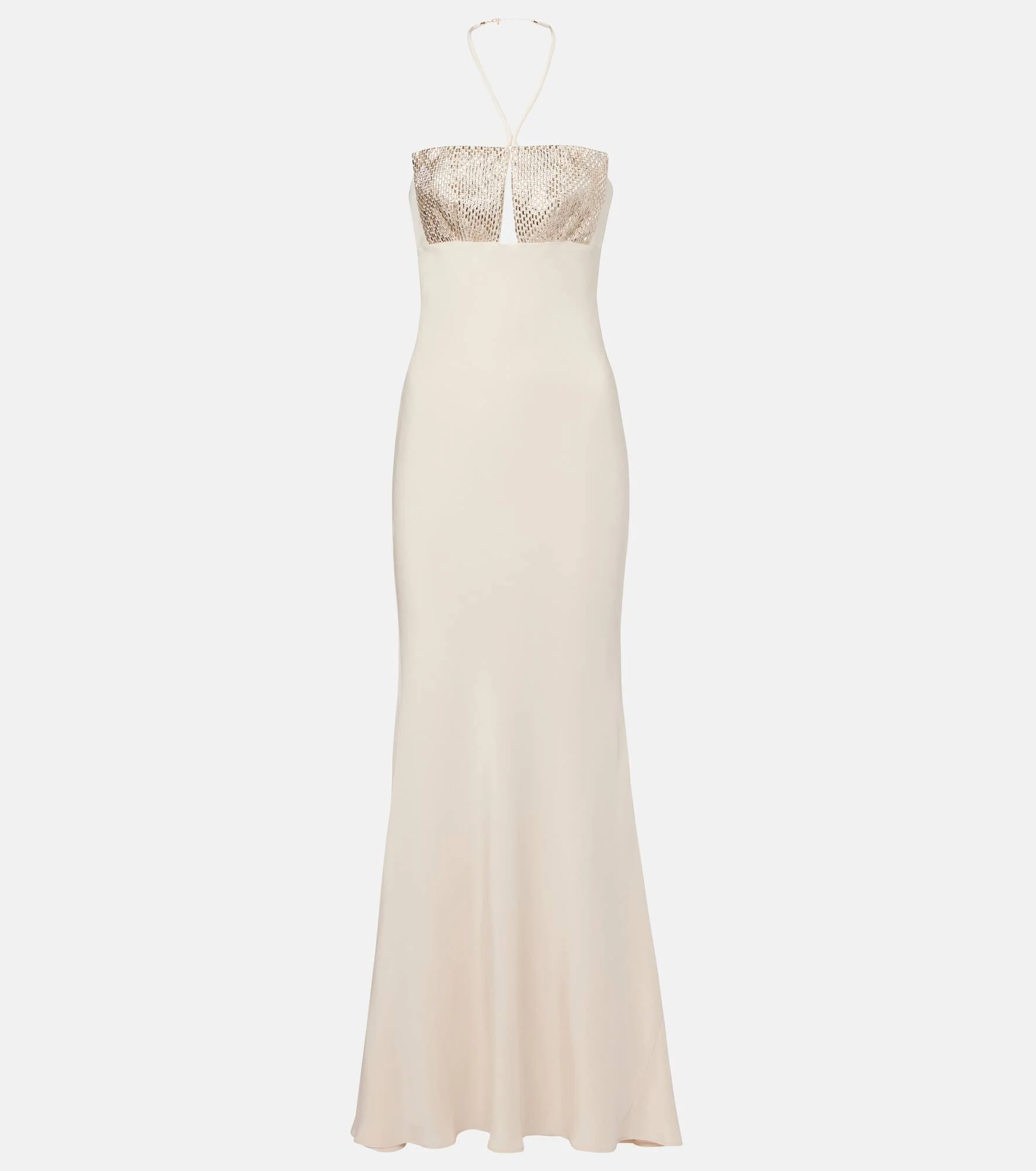 This elegant Roland Mouret gown is crafted from silk and adorned with delicate embellishments. Designed with a graceful halter neckline and a flattering silhouette, this piece is finished with a concealed zip at the back for a seamless look. Product Details - Material: 100% silk - Care instructions: dry clean - Made in China - Designer color name: Champagne - Item color: beige - Material II: 95% polyamide, 5% elastane - Material III: 100% polyester - Lining: 100% polyester - Lining II: 84% polyester, 16% elastane - Hook-fastening built-in bustier - Item number: P01060452 Size & Fit - Fits large to size - we recommend trying one size smaller - Cinched waist - Non-stretchy fabric - The model seen in the picture is 178cm-5'10" and wearing a size UK 6