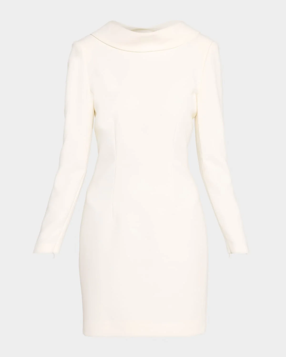 Crafted from crepe, this dress from Roland Mouret features an extended foldover neckline that dips in the back Boat neckline Long sleeves Padded shoulders Sheath silhouette Midthigh length Invisible back zip Polyester/viscose Imported