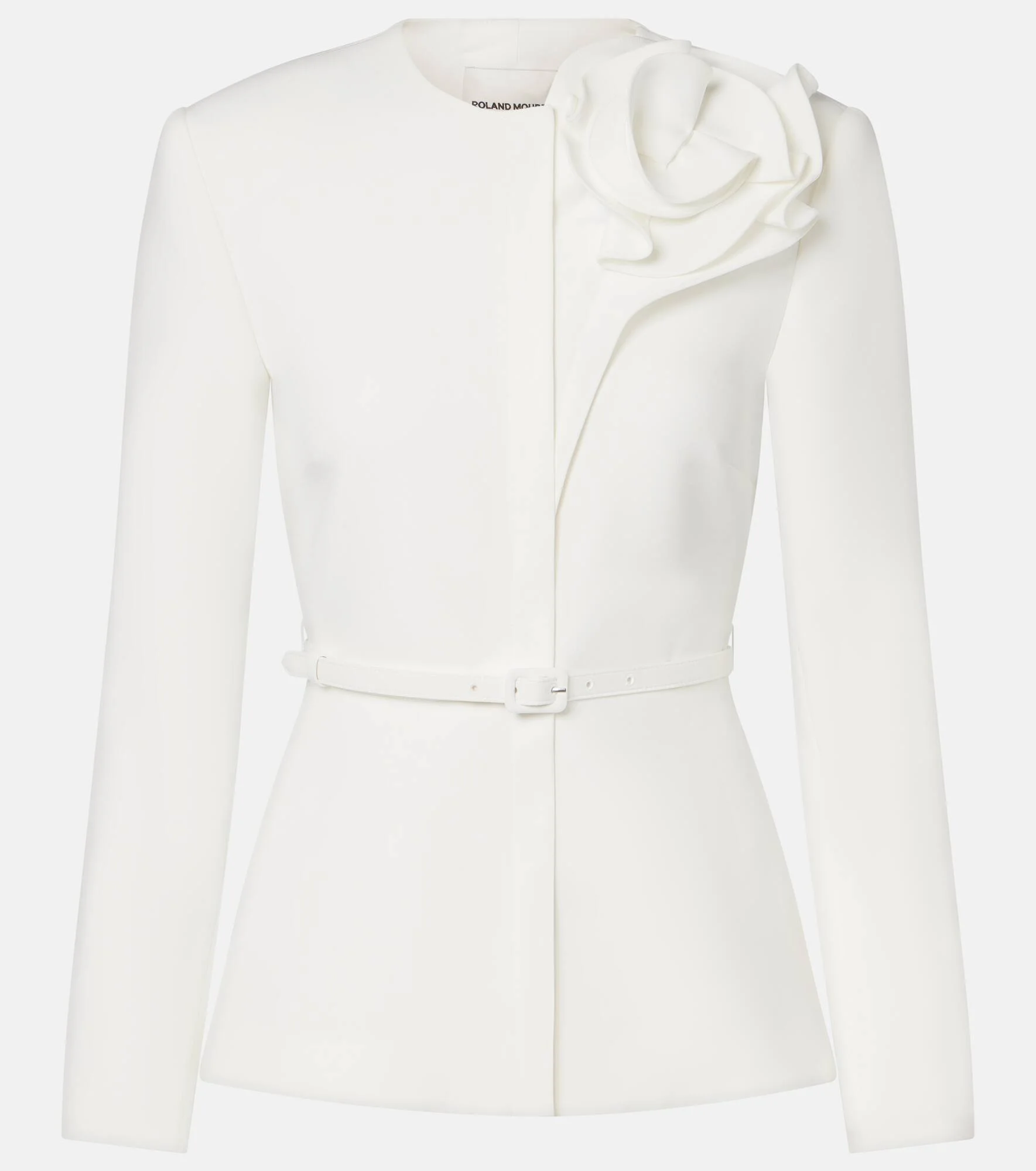 Roland Mouret seamlessly blends modern sophistication with an air of ease. A staple for desk-to-dinner days, this sculptural jacket is crafted from lightweight crepe and finished with a detachable belt and a tonal floral applique. Product Details - Material: 91% polyester, 9% elastane - Care instructions: dry clean - Made in China - Color: white - Designer color name: Cream - Lining: 96% viscose, 4% elastane - Detachable belt - Cuff: four buttons - Closure: concealed zipped front - Item number: P01166099 Size & Fit - Fits small to size - we recommend trying one size larger - Cinched waist - Non-stretchy fabric - Falls to the hip - The model seen in the picture is 178cm-5'10" and wearing a size UK 8