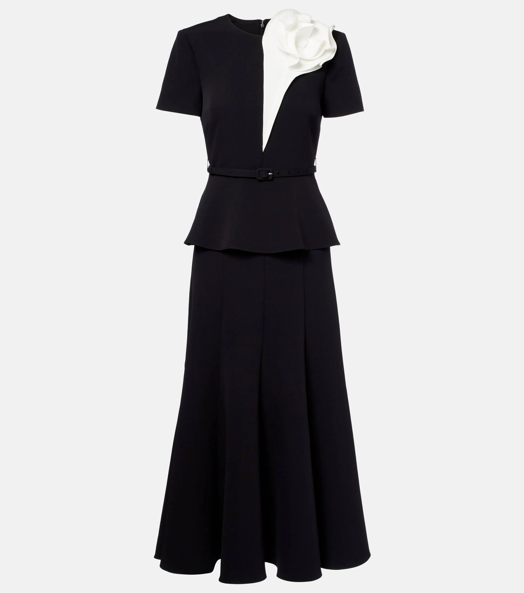 Exude glamour in this midi dress from Roland Mouret. This short-sleeved style is crafted from crepe and boasts a contrasting floral-applique, a peplum, and a tonal belt at the waist. Product Details - Material: 91% polyester, 9% elastane - Care instructions: dry clean - Made in China - Color: black - Designer color name: Black - Closure: concealed zipped back - Lining: 100% polyester - Detachable belt - Item number: P01166072 Size & Fit - True to size - Shoulder pad inserts - Cinched waist - Adjustable at the waist - Non-stretchy fabric - The model seen in the picture is 178cm-5'10" and wearing a size UK 6