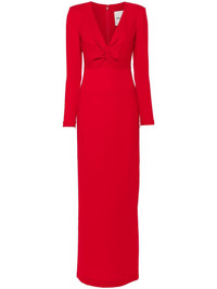 cady gown Highlights - Ruby red - Cady texture - Knot detailing - Dart detailing - V-neck - Concealed rear hook and zip fastening - Detachable shoulder pads - Long sleeves - Cuff zips - Fitted waistline - Rear slit - Straight hem - Floor-length - Partial lining Imported Composition Outer: Acetate 70%, Polyester 30% Lining: Polyester 100% SIZE & FIT Model measurements Height 5 ft 9 in(1.75 m) Bust/Chest 34.64 in(88 cm) Hips 36.61 in(93 cm) Waist 26.37 in(67 cm) Measurement SLEEVE LENGTH 24.4 in(62 cm) HIPS 40.15 in(102 cm) LENGTH 61.02 in(155 cm) WAIST 31.49 in(80 cm) FittingInformation Designed for a slim fit that sits just away from the body offering a close yet comfortable fit The internal shoulder pads offer a structured shape Made from a midweight non-stretch fabric This piece fits true to size – take your usual size Washing instructions Dry Clean Only