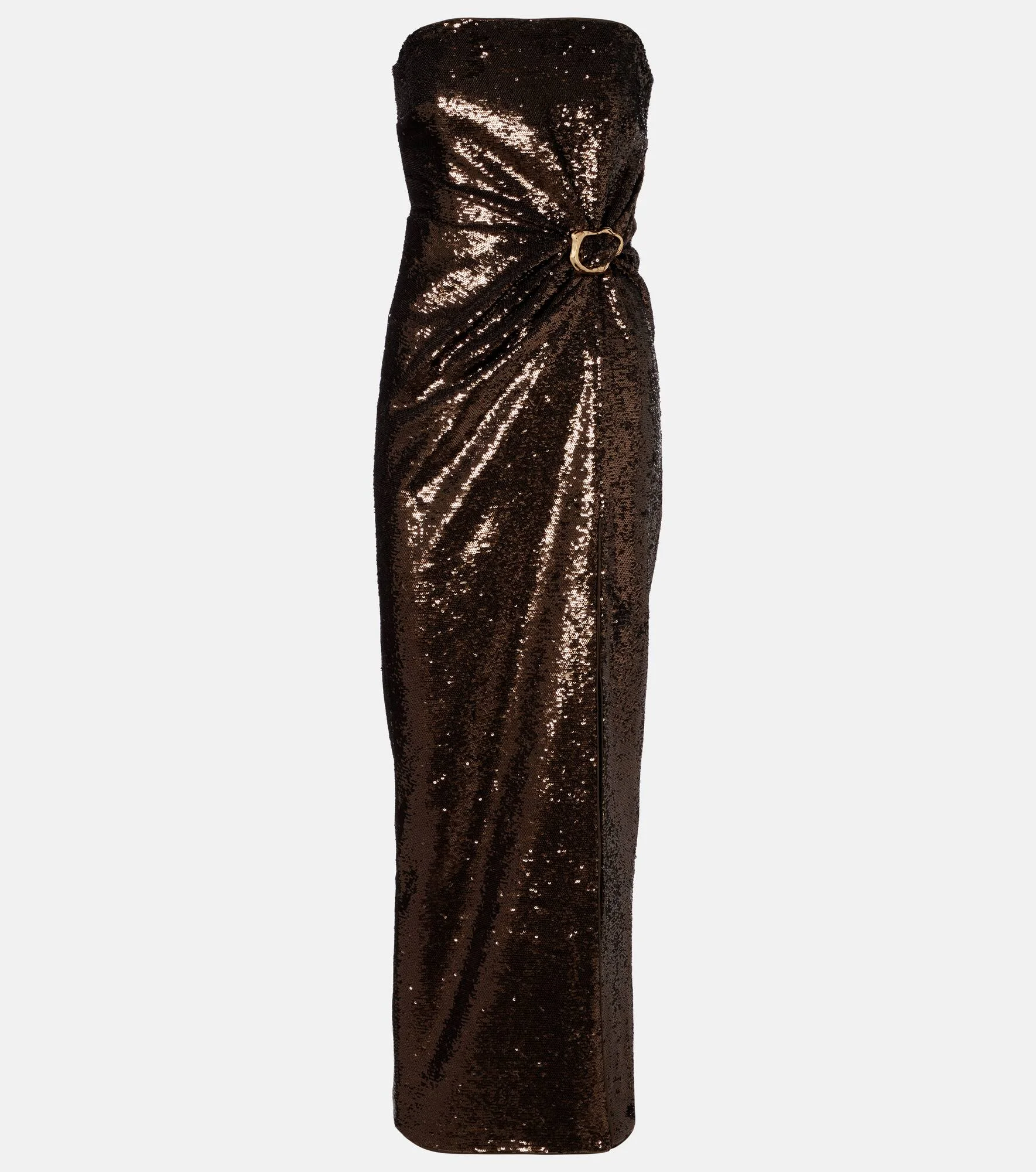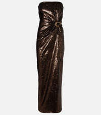 A unique understanding of precise tailoring sets Roland Mouret apart, seamlessly blending modern sophistication with an air of ease. This gathered gown boasts all-over sequins and an elegant strapless neckline. Product Details - Material: 94% polyamide, 6% elastane - Care instructions: dry clean - Made in China - Designer color name: Dark Olive - Item color: green - Material II: 100% polyester - Material III: 87% polyester, 13% elastane - Lining: 100% polyester - Hardware color: gold - Closure: concealed zipped back - Hook-fastening built-in bustier - Long vent - Item number: P01104662 Size & Fit - True to size - Strapless - Internal boned corset for support - Fitted - Non-stretchy fabric - The model seen in the picture is 178cm-5'10" and wearing a size UK 6