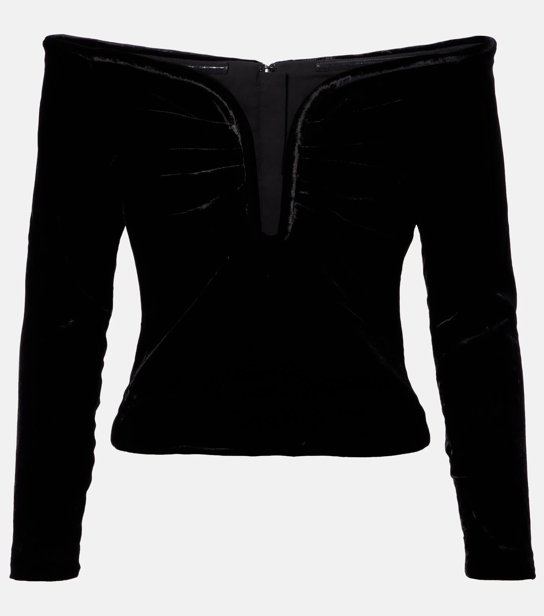 A unique understanding of precise tailoring sets Roland Mouret apart, seamlessly blending modern sophistication with an air of ease. This top is crafted from soft velvet, has an off-shoulder neckline, and is complete with a keyhole cutout. Product Details - Material: 77% viscose, 21% silk, 2% elastane - Care instructions: dry clean - Made in China - Designer color name: Black - Item color: black - Lining: 100% polyester - Lining II: 84% polyester, 16% elastane - Hook-fastening built-in bustier - Closure: concealed zipped back - Item number: P01104668 Size & Fit - True to size - Off-the-shoulder - Cinched waist - Non-stretchy fabric - Slightly cropped - The model seen in the picture is 178cm-5'10" and wearing a size UK 6