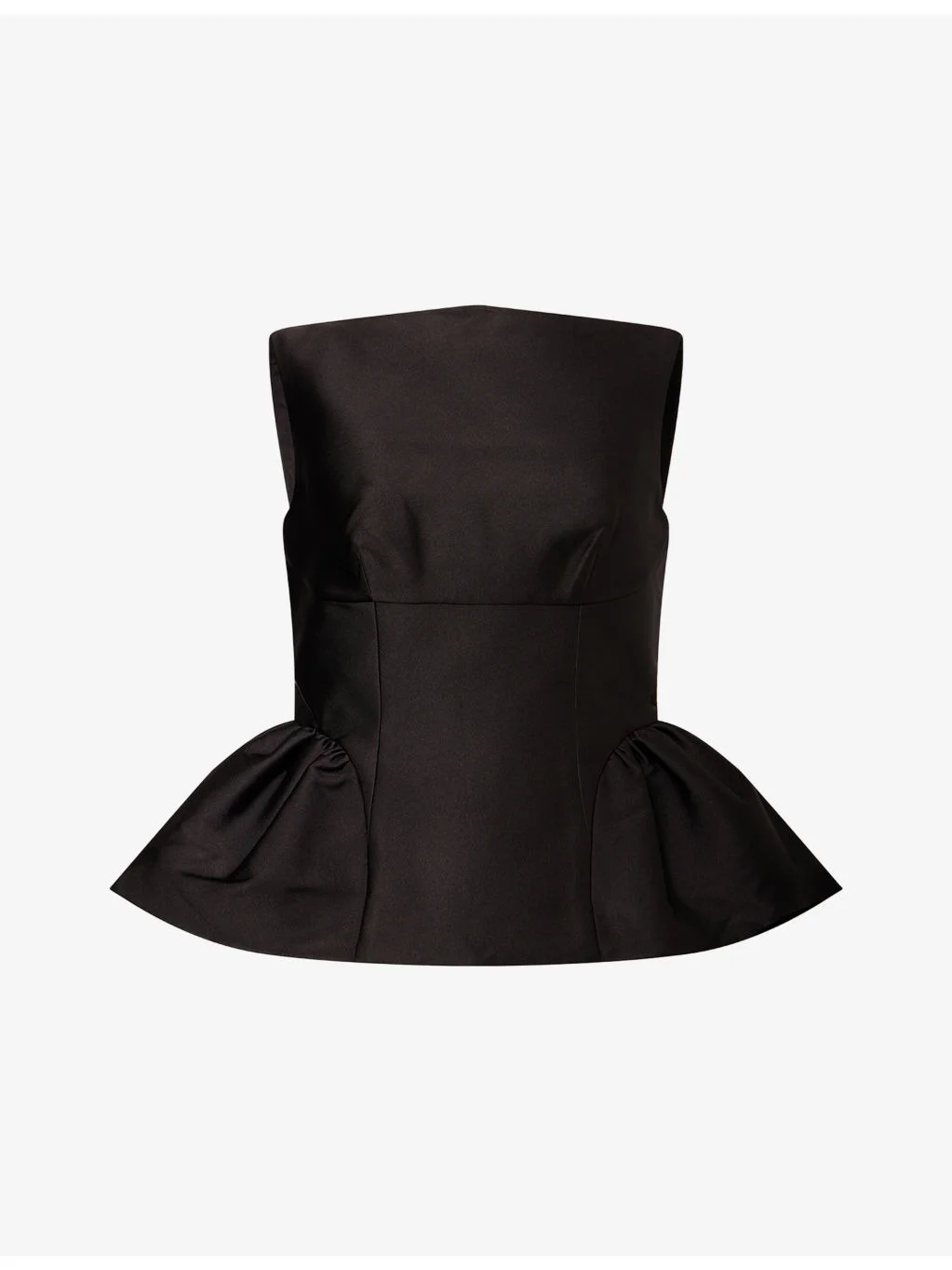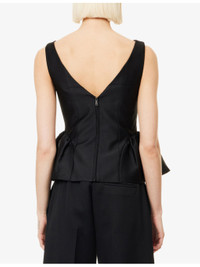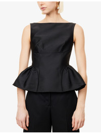 PRODUCT DETAILS - Roland Mouret taffeta top - 86% polyester, 14% silk; lining 100% polyester - Concealed zip fastening at back - Fitted bodice, cinched waist, boat neckline, scoop back, sleeveless, shoulder straps, structured ruffled hem at sides, part lined - Dry clean - True to size - Model is 5ft 10in/1.78m and wears a size UK 8 - Lightweight, non-stretch Ref: R04603746