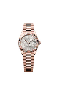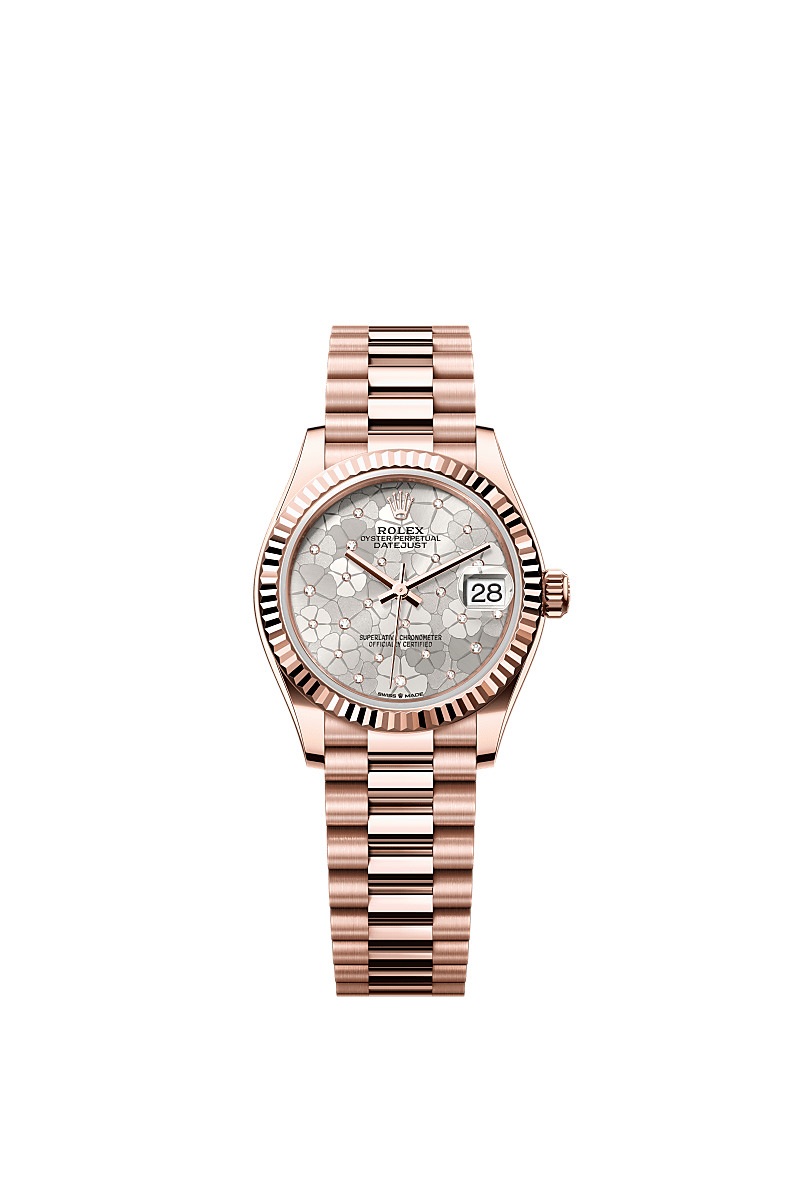 Oyster, 31 mm, Everose gold Reference278275 Make a date of a day This Oyster PerpetualDatejust 31in18 ct Everose goldfeaturesa silver floral-motif, diamond-setdial anda Presidentbracelet. Silver dial Floral motif The floral-motif dials combine three different finishes – sunray, matt and grained. High-technology finishing techniques were required to create this motif, a shining example of refined dial-making expertise. The textural effects are further enhanced by 24 diamonds of varying sizes, which illuminate the centre of each flower. Fluted bezel A Rolex signature The Rolex fluted bezel is a mark of distinction. Originally, the fluting of the Oyster bezel had a functional purpose: it served to screw the bezel onto the case helping to ensure the waterproofness of the watch. It was therefore identical to the fluting on the case back, which was also screwed onto the case for waterproofness, using specific Rolex tools. Over time, the fluting became an aesthetic element, a genuine Rolex signature feature. Today the fluted bezel is a mark of distinction, in gold on this Datejust 31. 18 ct Everose gold An exclusive patent To preserve the beauty of its pink gold watches, Rolex created and patented an exclusive 18 ct pink gold alloy cast in its own foundry: Everose gold. Introduced in 2005, 18 ct Everose is used on all Rolex Oyster models in pink gold. The President bracelet The ultimate refinement The design, development and production of Rolex bracelets and clasps, as well as the stringent tests they face, involve advanced high technology. And, as with all the components of the watch, aesthetic controls by the human eye guarantee impeccable beauty. The President bracelet, with its semi-circular three piece links, was created in 1956 for the launch of the Oyster Perpetual Day-Date. It represents the ultimate in refinement and comfort and is always made of carefully selected precious metals.