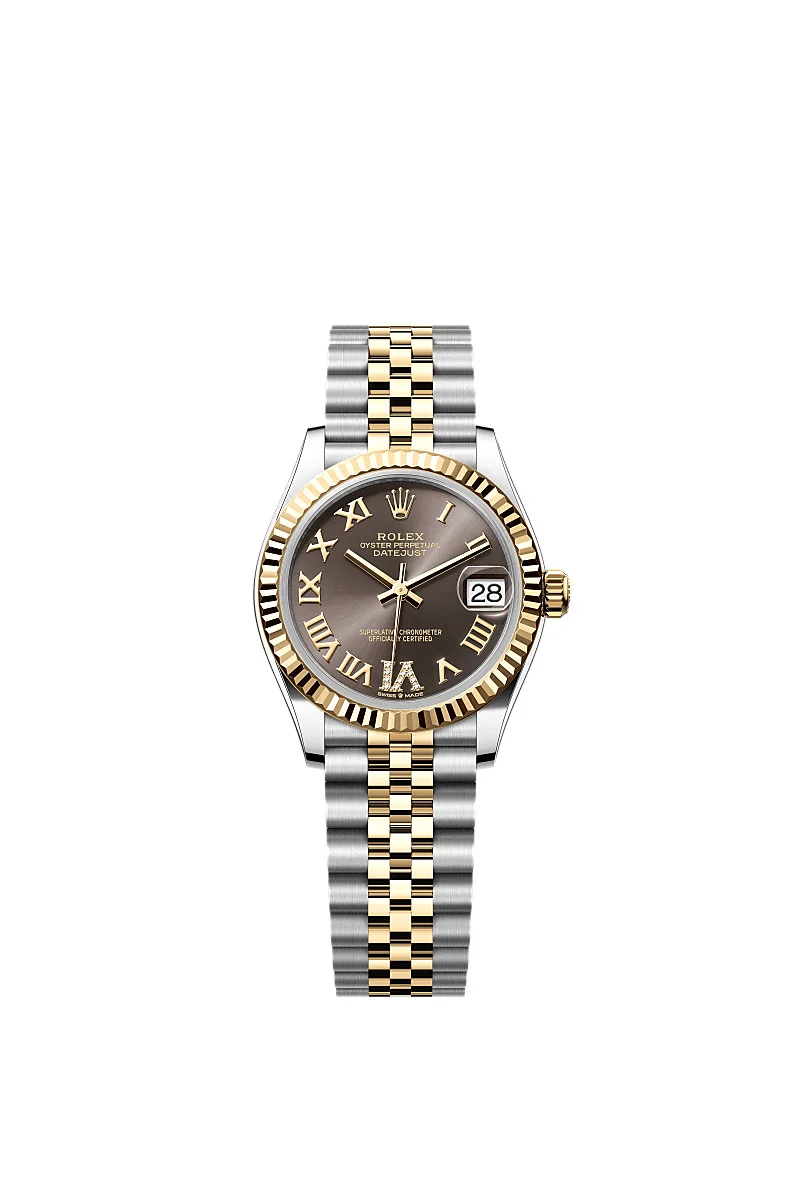 Oyster, 31 mm, Oystersteel and yellow gold Reference278273 Make a date of a day This Oyster PerpetualDatejust 31inOystersteel and yellow goldfeaturesa dark grey, diamond-setdial anda Jubileebracelet. Dark Grey Dial A watchmaking technique This dial features a large VI set with 11 diamonds. The sunray finish creates delicate light reflections on many dials in the Oyster Perpetual collection. It is obtained using masterful brushing techniques that create grooves running outwards from the centre of the dial. Light is diffused consistently along each engraving, creating a characteristic subtle glow that moves depending on the position of the wrist. Once the sunray finish has been completed, the dial colour is applied using Physical Vapour Deposition or electroplating. A light coat of varnish gives the dial its final look. Fluted bezel A Rolex signature The Rolex fluted bezel is a mark of distinction. Originally, the fluting of the Oyster bezel had a functional purpose: it served to screw the bezel onto the case helping to ensure the waterproofness of the watch. It was therefore identical to the fluting on the case back, which was also screwed onto the case for waterproofness, using specific Rolex tools. Over time, the fluting became an aesthetic element, a genuine Rolex signature feature. Today the fluted bezel is a mark of distinction, in gold on this Datejust 31. Yellow Rolesor A meeting of two metals Gold is coveted for its lustre and nobility. Steel reinforces strength and reliability. Together, they harmoniously combine the best of their properties. A true Rolex signature, Rolesor has featured on Rolex models since the early 1930s, and was trademarked as a name in 1933. It is one of the prominent pillars of the Oyster collection. The Jubilee bracelet Supple and comfortable The design, development and production of Rolex bracelets and clasps, as well as the stringent tests they face, involve advanced high technology. And, as with all the components of the watch, aesthetic controls by the human eye guarantee impeccable beauty. The Jubilee, a supple and comfortable five-piece link metal bracelet, was designed and made especially for the launch of the Oyster Perpetual Datejust in 1945.