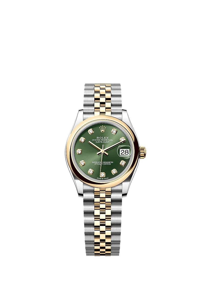 Oyster, 31 mm, Oystersteel and yellow gold Reference278243 Make a date of a day This Oyster PerpetualDatejust 31inOystersteel and yellow goldfeaturesan olive-green, diamond-setdial anda Jubileebracelet. Olive-Green Dial A watchmaking technique This dial features diamonds in 18 ct gold settings. The sunray finish creates delicate light reflections on many dials in the Oyster Perpetual collection. It is obtained using masterful brushing techniques that create grooves running outwards from the centre of the dial. Light is diffused consistently along each engraving, creating a characteristic subtle glow that moves depending on the position of the wrist. Once the sunray finish has been completed, the dial colour is applied using Physical Vapour Deposition or electroplating. A light coat of varnish gives the dial its final look. Yellow Rolesor A meeting of two metals Gold is coveted for its lustre and nobility. Steel reinforces strength and reliability. Together, they harmoniously combine the best of their properties. A true Rolex signature, Rolesor has featured on Rolex models since the early 1930s, and was trademarked as a name in 1933. It is one of the prominent pillars of the Oyster collection. The Jubilee bracelet Supple and comfortable The design, development and production of Rolex bracelets and clasps, as well as the stringent tests they face, involve advanced high technology. And, as with all the components of the watch, aesthetic controls by the human eye guarantee impeccable beauty. The Jubilee, a supple and comfortable five-piece link metal bracelet, was designed and made especially for the launch of the Oyster Perpetual Datejust in 1945.