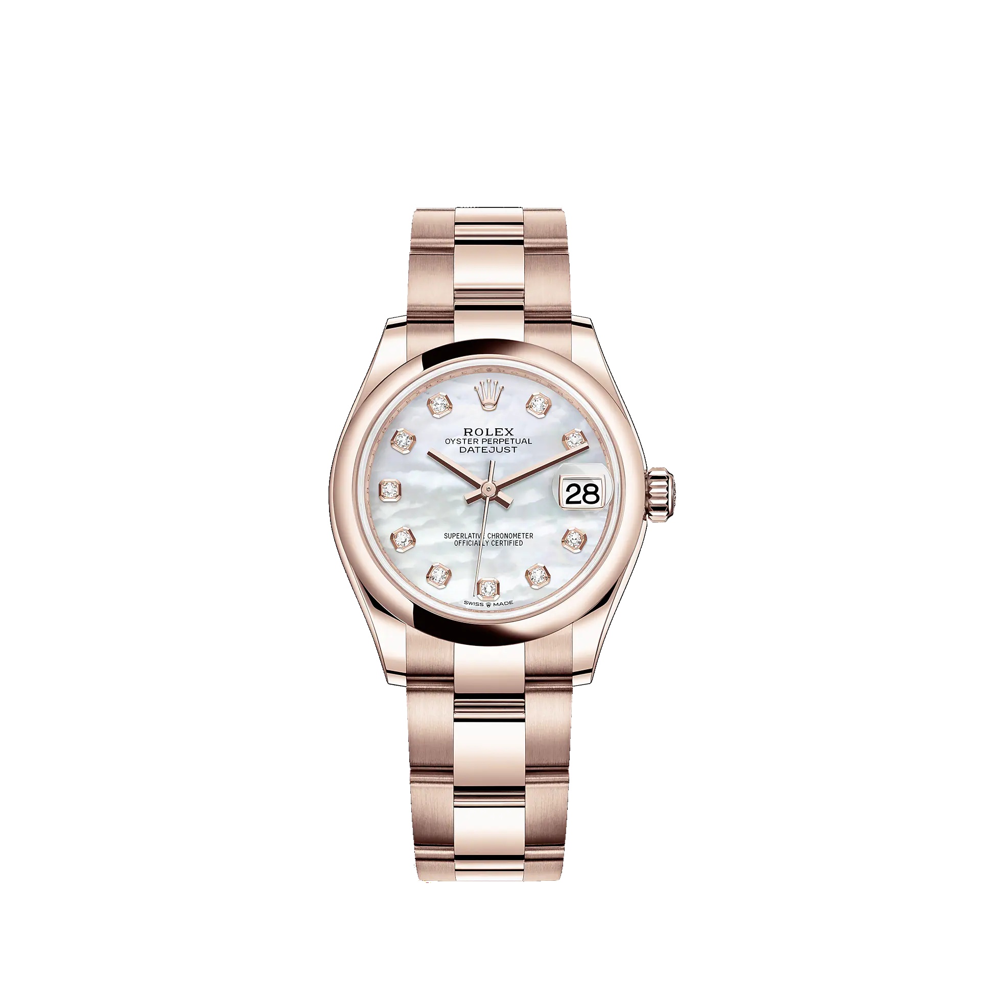 Oyster, 31 mm, Everose gold THIS OYSTER PERPETUAL DATEJUST 31 IN 18 CT EVEROSE GOLD FEATURES A WHITE MOTHER-OF-PEARL, DIAMOND-SET DIAL AND AN OYSTER BRACELET. Its dial features Diamonds in 18 ct gold settings. The light reflections on the case sides and lugs highlight the elegant profile of the 31 mm Oyster case, which is fitted with a Domed bezel. Aesthetically, the Datejust has spanned eras, while retaining the enduring codes that make it, notably in its traditional versions, one of the most recognized and recognizable of watches. Model features - 18 CT EVEROSE GOLD - THE OYSTER BRACELET - THE CYCLOPS LENS - 2236 MOVEMENT Specifications Reference 278245