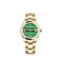 Oyster, 31 mm, yellow gold THIS OYSTER PERPETUAL DATEJUST 31 IN 18 CT YELLOW GOLD FEATURES A MALACHITE, DIAMOND-SET DIAL AND AN OYSTER BRACELET. Its dial features Roman VI and IX in 18 ct gold, set with 24 diamonds. The light reflections on the case sides and lugs highlight the elegant profile of the 31 mm Oyster case, which is fitted with a Domed bezel. Aesthetically, the Datejust has spanned eras, while retaining the enduring codes that make it, notably in its traditional versions, one of the most recognized and recognizable of watches. Model features - 18 CT YELLOW GOLD - THE OYSTER BRACELET - THE CYCLOPS LENS - 2236 MOVEMENT Specifications Reference 278248
