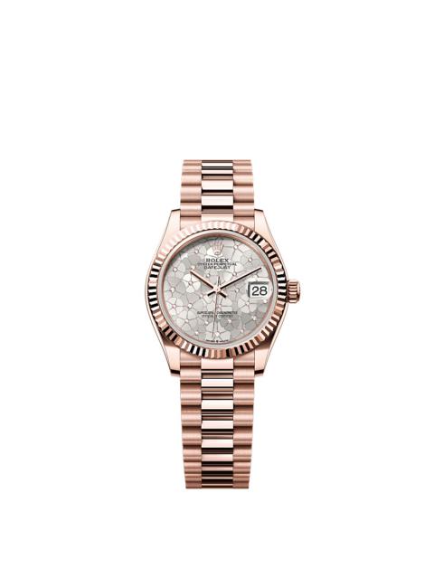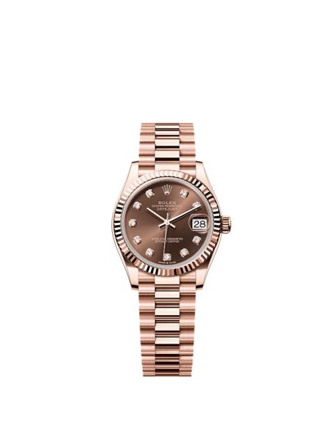 Oyster, 31 mm, Everose gold THIS OYSTER PERPETUAL DATEJUST 31 IN 18 CT EVEROSE GOLD FEATURES A CHOCOLATE, DIAMOND-SET DIAL AND AN OYSTER BRACELET. Its dial features Diamonds in 18 ct gold settings. The light reflections on the case sides and lugs highlight the elegant profile of the 31 mm Oyster case, which is fitted with a Fluted bezel. Aesthetically, the Datejust has spanned eras, while retaining the enduring codes that make it, notably in its traditional versions, one of the most recognized and recognizable of watches. Model features - THE FLUTED BEZEL - 18 CT EVEROSE GOLD - THE OYSTER BRACELET - THE CYCLOPS LENS - 2236 MOVEMENT Specifications Reference 278275