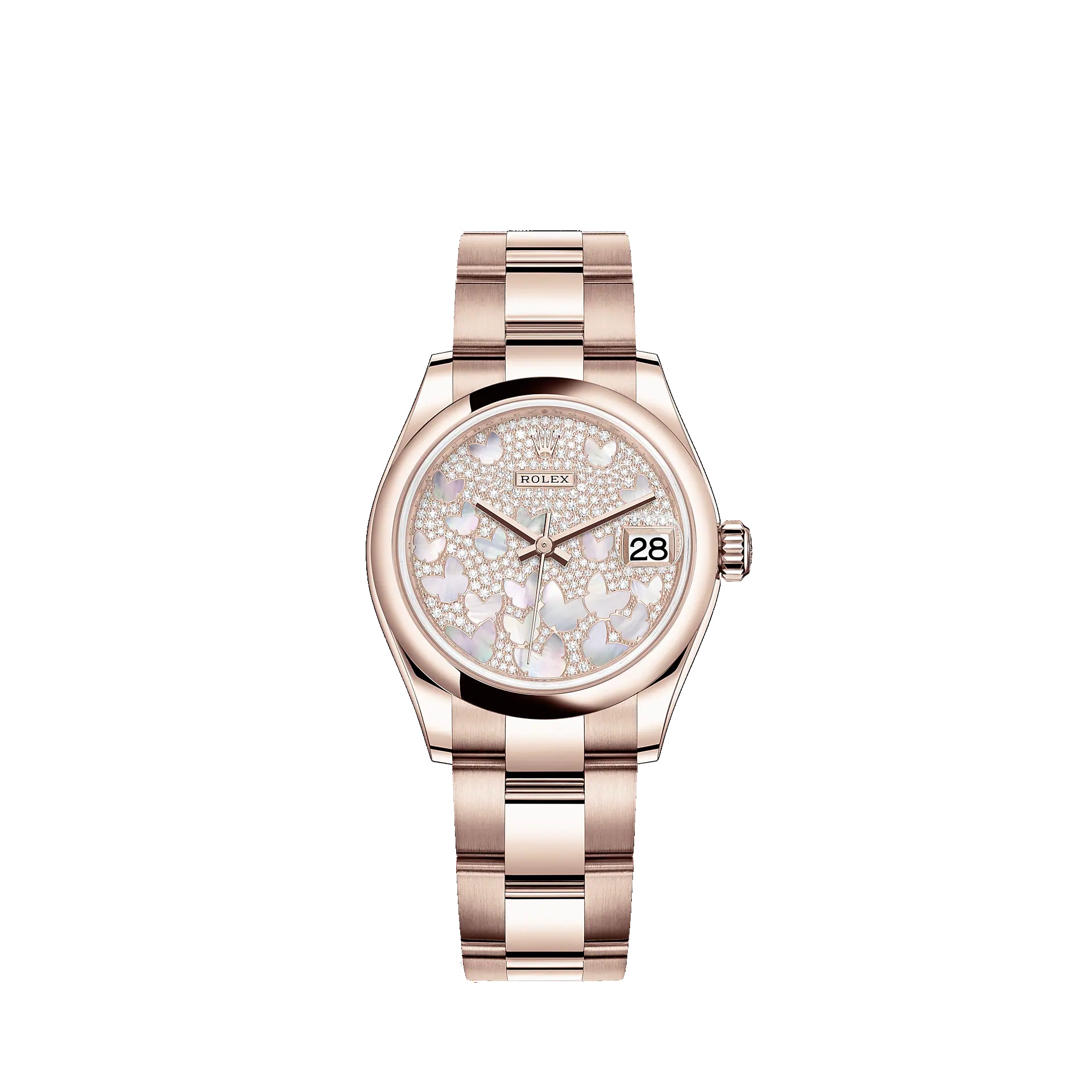 Oyster, 31 mm, Everose gold THIS OYSTER PERPETUAL DATEJUST 31 IN 18 CT EVEROSE GOLD FEATURES A DIAMOND-PAVED, WITH PINK MOTHER-OF-PEARL BUTTERFLIES, DIAL AND AN OYSTER BRACELET. The light reflections on the case sides and lugs highlight the elegant profile of the 31 mm Oyster case, which is fitted with a Domed bezel. Aesthetically, the Datejust has spanned eras, while retaining the enduring codes that make it, notably in its traditional versions, one of the most recognized and recognizable of watches. Model features - 18 CT EVEROSE GOLD - THE OYSTER BRACELET - THE CYCLOPS LENS - 2236 MOVEMENT Specifications Reference 278245