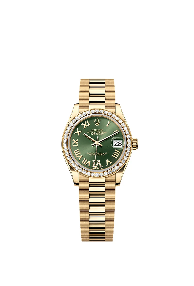 Oyster, 31 mm, yellow gold and diamonds Reference278288RBR Make a date of a day This Oyster PerpetualDatejust 31in18 ct yellow goldfeaturesan olive-green, diamond-setdial anda Presidentbracelet. Olive-Green Dial A watchmaking technique This dial features a large VI set with 11 diamonds. The sunray finish creates delicate light reflections on many dials in the Oyster Perpetual collection. It is obtained using masterful brushing techniques that create grooves running outwards from the centre of the dial. Light is diffused consistently along each engraving, creating a characteristic subtle glow that moves depending on the position of the wrist. Once the sunray finish has been completed, the dial colour is applied using Physical Vapour Deposition or electroplating. A light coat of varnish gives the dial its final look. Diamond-set bezel A sparkling symphony Gem-setters, like sculptors, finely carve the precious metal to hand-shape the seat in which each gemstone will be perfectly lodged. With the art and craft of a jeweller, the stone is placed and meticulously aligned with the others, then firmly secured in its gold or platinum setting. Besides the intrinsic quality of the stones, several other criteria contribute to the beauty of Rolex gem-setting: the precise alignment of the height of the gems, their orientation and position, the regularity, strength and proportions of the setting as well as the intricate finishing of the metalwork. A sparkling symphony to enhance the watch and enchant the wearer. 18 ct yellow gold Commitment to excellence By operating its own exclusive foundry, Rolex has the unrivalled ability to cast the highest quality 18 ct gold alloys. According to the proportion of silver, copper, platinum or palladium added, different types of 18 ct gold are obtained: yellow, pink or white. They are made with only the purest metals and meticulously inspected in an in-house laboratory with state-of-the-art equipment, before the gold is formed and shaped with the same painstaking attention to quality. Rolex's commitment to excellence begins at the source. The President bracelet The ultimate refinement The design, development and production of Rolex bracelets and clasps, as well as the stringent tests they face, involve advanced high technology. And, as with all the components of the watch, aesthetic controls by the human eye guarantee impeccable beauty. The President bracelet, with its semi-circular three piece links, was created in 1956 for the launch of the Oyster Perpetual Day-Date. It represents the ultimate in refinement and comfort and is always made of carefully selected precious metals.