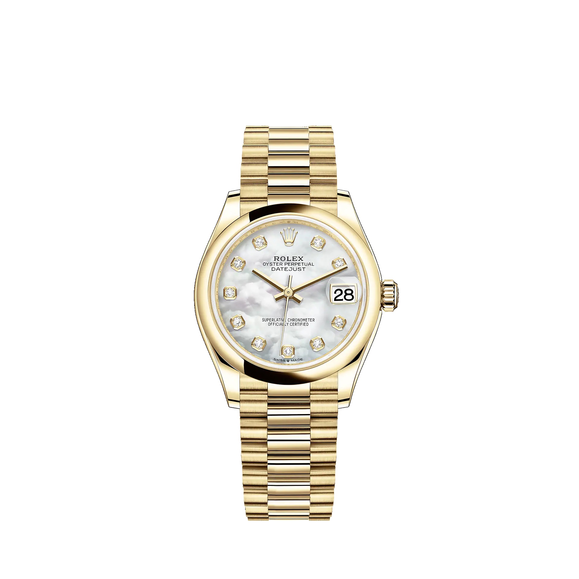 Oyster, 31 mm, yellow gold THIS OYSTER PERPETUAL DATEJUST 31 IN 18 CT YELLOW GOLD FEATURES A WHITE MOTHER-OF-PEARL, DIAMOND-SET DIAL AND A PRESIDENT BRACELET. Its dial features Diamonds in 18 ct gold settings. The light reflections on the case sides and lugs highlight the elegant profile of the 31 mm Oyster case, which is fitted with a Domed bezel. Aesthetically, the Datejust has spanned eras, while retaining the enduring codes that make it, notably in its traditional versions, one of the most recognized and recognizable of watches. Model features - 18 CT YELLOW GOLD - THE PRESIDENT BRACELET - THE CYCLOPS LENS - 2236 MOVEMENT Specifications Reference 278248