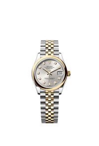 Oyster, 31 mm, Oystersteel and yellow gold Reference278243 Make a date of a day This Oyster PerpetualDatejust 31inOystersteel and yellow goldfeaturesa silver, diamond-setdial anda Jubileebracelet. Silver dial A watchmaking technique This dial features diamonds in 18 ct gold settings. The sunray finish creates delicate light reflections on many dials in the Oyster Perpetual collection. It is obtained using masterful brushing techniques that create grooves running outwards from the centre of the dial. Light is diffused consistently along each engraving, creating a characteristic subtle glow that moves depending on the position of the wrist. Once the sunray finish has been completed, the dial colour is applied using Physical Vapour Deposition or electroplating. A light coat of varnish gives the dial its final look. Yellow Rolesor A meeting of two metals Gold is coveted for its lustre and nobility. Steel reinforces strength and reliability. Together, they harmoniously combine the best of their properties. A true Rolex signature, Rolesor has featured on Rolex models since the early 1930s, and was trademarked as a name in 1933. It is one of the prominent pillars of the Oyster collection. The Jubilee bracelet Supple and comfortable The design, development and production of Rolex bracelets and clasps, as well as the stringent tests they face, involve advanced high technology. And, as with all the components of the watch, aesthetic controls by the human eye guarantee impeccable beauty. The Jubilee, a supple and comfortable five-piece link metal bracelet, was designed and made especially for the launch of the Oyster Perpetual Datejust in 1945.