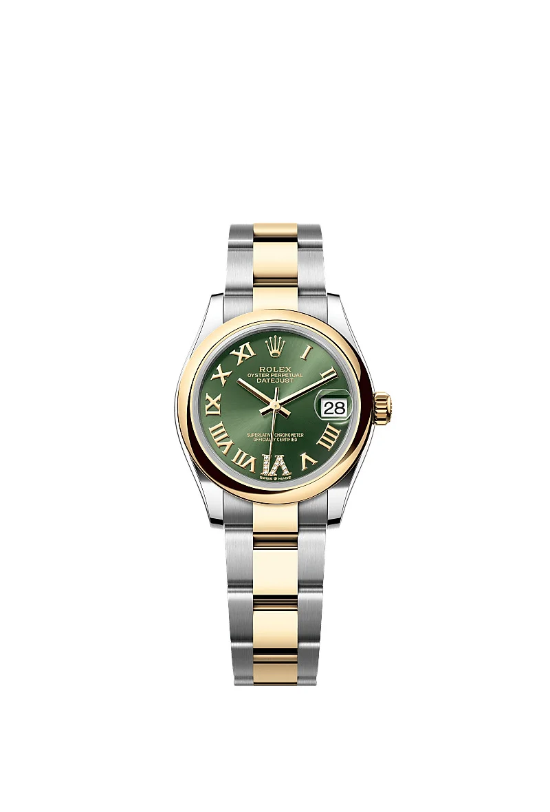 Oyster, 31 mm, Oystersteel and yellow gold Reference278243 Make a date of a day This Oyster PerpetualDatejust 31inOystersteel and yellow goldfeaturesan olive-green, diamond-setdial andan Oysterbracelet. Olive-Green Dial A watchmaking technique This dial features a large VI set with 11 diamonds. The sunray finish creates delicate light reflections on many dials in the Oyster Perpetual collection. It is obtained using masterful brushing techniques that create grooves running outwards from the centre of the dial. Light is diffused consistently along each engraving, creating a characteristic subtle glow that moves depending on the position of the wrist. Once the sunray finish has been completed, the dial colour is applied using Physical Vapour Deposition or electroplating. A light coat of varnish gives the dial its final look. Yellow Rolesor A meeting of two metals Gold is coveted for its lustre and nobility. Steel reinforces strength and reliability. Together, they harmoniously combine the best of their properties. A true Rolex signature, Rolesor has featured on Rolex models since the early 1930s, and was trademarked as a name in 1933. It is one of the prominent pillars of the Oyster collection. The Oyster bracelet Alchemy of form and function The Oyster bracelet is a perfect alchemy of form and function, aesthetics and technology, designed to be both robust and comfortable. It is equipped with an Oysterclasp and the Easylink comfort extension link, also exclusive to Rolex. This ingenious system allows the wearer to increase the bracelet length by approximately 5 mm, providing additional comfort in any circumstance.