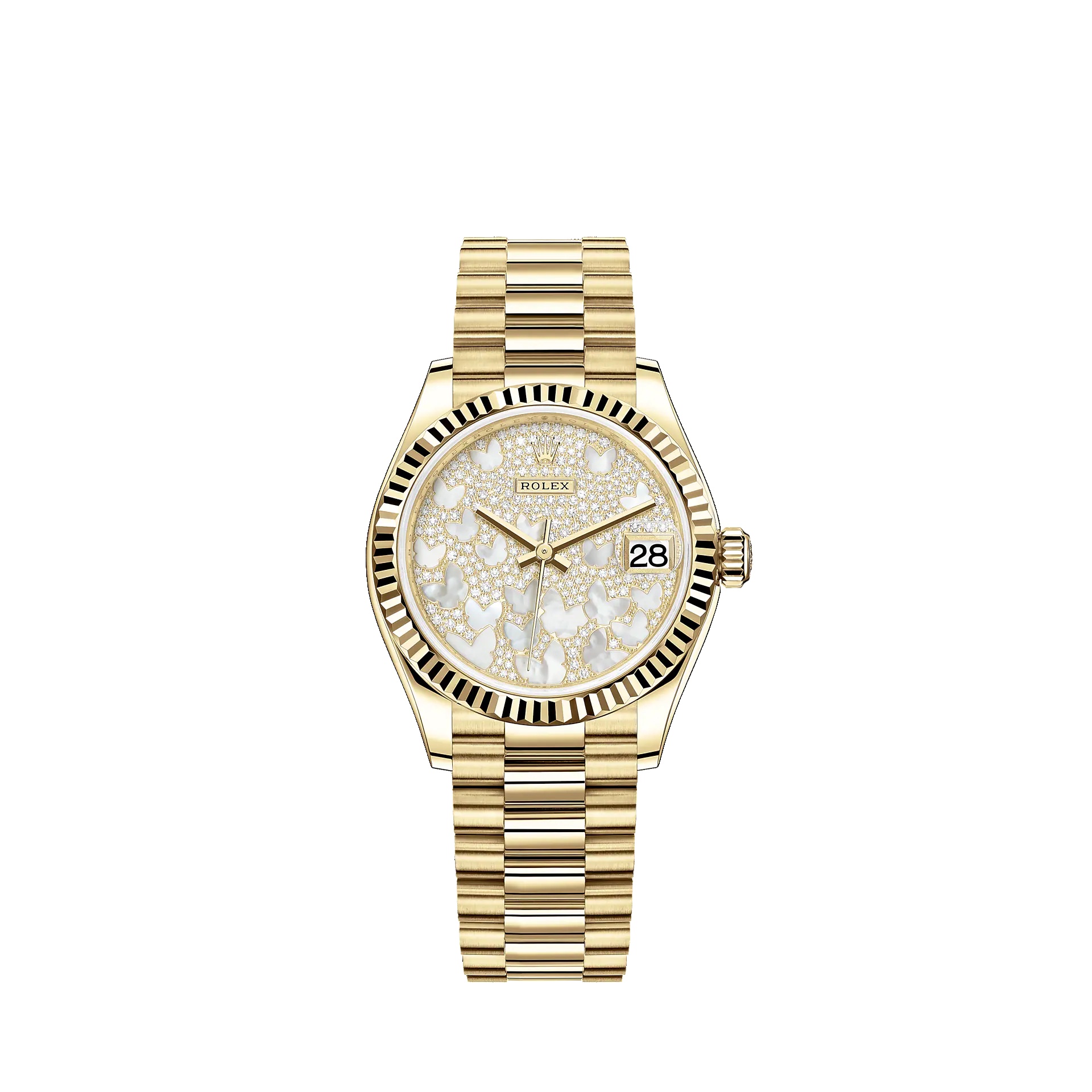 Oyster, 31 mm, yellow gold THIS OYSTER PERPETUAL DATEJUST 31 IN 18 CT YELLOW GOLD FEATURES A DIAMOND-PAVED, WITH WHITE MOTHER-OF-PEARL BUTTERFLIES, DIAL AND A PRESIDENT BRACELET. The light reflections on the case sides and lugs highlight the elegant profile of the 31 mm Oyster case, which is fitted with a Fluted bezel. Aesthetically, the Datejust has spanned eras, while retaining the enduring codes that make it, notably in its traditional versions, one of the most recognized and recognizable of watches. Model features - THE FLUTED BEZEL - 18 CT YELLOW GOLD - THE PRESIDENT BRACELET - THE CYCLOPS LENS - 2236 MOVEMENT Specifications Reference 278278