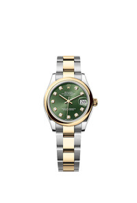 Oyster, 31 mm, Oystersteel and yellow gold Reference278243 Make a date of a day This Oyster PerpetualDatejust 31inOystersteel and yellow goldfeaturesan olive-green, diamond-setdial andan Oysterbracelet. Olive-Green Dial A watchmaking technique This dial features diamonds in 18 ct gold settings. The sunray finish creates delicate light reflections on many dials in the Oyster Perpetual collection. It is obtained using masterful brushing techniques that create grooves running outwards from the centre of the dial. Light is diffused consistently along each engraving, creating a characteristic subtle glow that moves depending on the position of the wrist. Once the sunray finish has been completed, the dial colour is applied using Physical Vapour Deposition or electroplating. A light coat of varnish gives the dial its final look. Yellow Rolesor A meeting of two metals Gold is coveted for its lustre and nobility. Steel reinforces strength and reliability. Together, they harmoniously combine the best of their properties. A true Rolex signature, Rolesor has featured on Rolex models since the early 1930s, and was trademarked as a name in 1933. It is one of the prominent pillars of the Oyster collection. The Oyster bracelet Alchemy of form and function The Oyster bracelet is a perfect alchemy of form and function, aesthetics and technology, designed to be both robust and comfortable. It is equipped with an Oysterclasp and the Easylink comfort extension link, also exclusive to Rolex. This ingenious system allows the wearer to increase the bracelet length by approximately 5 mm, providing additional comfort in any circumstance.