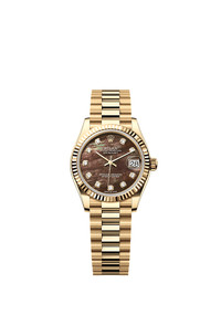 Oyster, 31 mm, yellow gold Reference278278 Make a date of a day This Oyster PerpetualDatejust 31in18 ct yellow goldfeaturesa black mother-of-pearl, diamond-setdial anda Presidentbracelet. Mother-of-Pearl Dial Highlighting natural beauty This dial features diamonds in 18 ct gold settings. Mother-of-pearl is by its nature full of mystery and surprises. Depending on its origin, it can be pink, white, black or yellow. It differs in colour, intensity and structure according to the part of the shell from which it is extracted. At Rolex, mother-of-pearl is never artificially coloured. Instead, particular know-how and skill are devoted to simply highlighting its natural beauty and preserving the original hues. As all mother-of-pearl dials are unique pieces, an identical dial will never be found on another wrist. Fluted bezel A Rolex signature The Rolex fluted bezel is a mark of distinction. Originally, the fluting of the Oyster bezel had a functional purpose: it served to screw the bezel onto the case helping to ensure the waterproofness of the watch. It was therefore identical to the fluting on the case back, which was also screwed onto the case for waterproofness, using specific Rolex tools. Over time, the fluting became an aesthetic element, a genuine Rolex signature feature. Today the fluted bezel is a mark of distinction, in gold on this Datejust 31. 18 ct yellow gold Commitment to excellence By operating its own exclusive foundry, Rolex has the unrivalled ability to cast the highest quality 18 ct gold alloys. According to the proportion of silver, copper, platinum or palladium added, different types of 18 ct gold are obtained: yellow, pink or white. They are made with only the purest metals and meticulously inspected in an in-house laboratory with state-of-the-art equipment, before the gold is formed and shaped with the same painstaking attention to quality. Rolex's commitment to excellence begins at the source. The President bracelet The ultimate refinement The design, development and production of Rolex bracelets and clasps, as well as the stringent tests they face, involve advanced high technology. And, as with all the components of the watch, aesthetic controls by the human eye guarantee impeccable beauty. The President bracelet, with its semi-circular three piece links, was created in 1956 for the launch of the Oyster Perpetual Day-Date. It represents the ultimate in refinement and comfort and is always made of carefully selected precious metals.