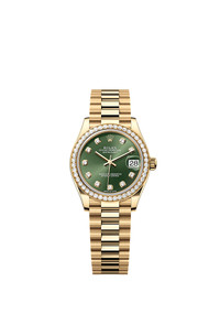 Oyster, 31 mm, yellow gold and diamonds Reference278288RBR Make a date of a day This Oyster PerpetualDatejust 31in18 ct yellow goldfeaturesan olive-green, diamond-setdial anda Presidentbracelet. Olive-Green Dial A watchmaking technique This dial features diamonds in 18 ct gold settings. The sunray finish creates delicate light reflections on many dials in the Oyster Perpetual collection. It is obtained using masterful brushing techniques that create grooves running outwards from the centre of the dial. Light is diffused consistently along each engraving, creating a characteristic subtle glow that moves depending on the position of the wrist. Once the sunray finish has been completed, the dial colour is applied using Physical Vapour Deposition or electroplating. A light coat of varnish gives the dial its final look. Diamond-set bezel A sparkling symphony Gem-setters, like sculptors, finely carve the precious metal to hand-shape the seat in which each gemstone will be perfectly lodged. With the art and craft of a jeweller, the stone is placed and meticulously aligned with the others, then firmly secured in its gold or platinum setting. Besides the intrinsic quality of the stones, several other criteria contribute to the beauty of Rolex gem-setting: the precise alignment of the height of the gems, their orientation and position, the regularity, strength and proportions of the setting as well as the intricate finishing of the metalwork. A sparkling symphony to enhance the watch and enchant the wearer. 18 ct yellow gold Commitment to excellence By operating its own exclusive foundry, Rolex has the unrivalled ability to cast the highest quality 18 ct gold alloys. According to the proportion of silver, copper, platinum or palladium added, different types of 18 ct gold are obtained: yellow, pink or white. They are made with only the purest metals and meticulously inspected in an in-house laboratory with state-of-the-art equipment, before the gold is formed and shaped with the same painstaking attention to quality. Rolex's commitment to excellence begins at the source. The President bracelet The ultimate refinement The design, development and production of Rolex bracelets and clasps, as well as the stringent tests they face, involve advanced high technology. And, as with all the components of the watch, aesthetic controls by the human eye guarantee impeccable beauty. The President bracelet, with its semi-circular three piece links, was created in 1956 for the launch of the Oyster Perpetual Day-Date. It represents the ultimate in refinement and comfort and is always made of carefully selected precious metals.