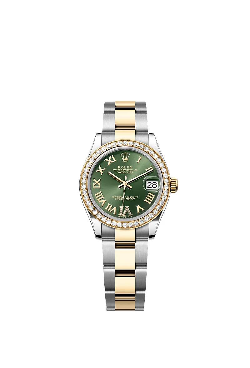 Oyster, 31 mm, Oystersteel, yellow gold and diamonds Reference278383RBR Make a date of a day This Oyster PerpetualDatejust 31inOystersteel and yellow goldfeaturesan olive-green, diamond-setdial andan Oysterbracelet. Olive-Green Dial A watchmaking technique This dial features a large VI set with 11 diamonds. The sunray finish creates delicate light reflections on many dials in the Oyster Perpetual collection. It is obtained using masterful brushing techniques that create grooves running outwards from the centre of the dial. Light is diffused consistently along each engraving, creating a characteristic subtle glow that moves depending on the position of the wrist. Once the sunray finish has been completed, the dial colour is applied using Physical Vapour Deposition or electroplating. A light coat of varnish gives the dial its final look. Diamond-set bezel A sparkling symphony Gem-setters, like sculptors, finely carve the precious metal to hand-shape the seat in which each gemstone will be perfectly lodged. With the art and craft of a jeweller, the stone is placed and meticulously aligned with the others, then firmly secured in its gold or platinum setting. Besides the intrinsic quality of the stones, several other criteria contribute to the beauty of Rolex gem-setting: the precise alignment of the height of the gems, their orientation and position, the regularity, strength and proportions of the setting as well as the intricate finishing of the metalwork. A sparkling symphony to enhance the watch and enchant the wearer. Yellow Rolesor A meeting of two metals Gold is coveted for its lustre and nobility. Steel reinforces strength and reliability. Together, they harmoniously combine the best of their properties. A true Rolex signature, Rolesor has featured on Rolex models since the early 1930s, and was trademarked as a name in 1933. It is one of the prominent pillars of the Oyster collection. The Oyster bracelet Alchemy of form and function The Oyster bracelet is a perfect alchemy of form and function, aesthetics and technology, designed to be both robust and comfortable. It is equipped with an Oysterclasp and the Easylink comfort extension link, also exclusive to Rolex. This ingenious system allows the wearer to increase the bracelet length by approximately 5 mm, providing additional comfort in any circumstance.