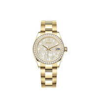 Oyster, 31 mm, yellow gold and diamonds THIS OYSTER PERPETUAL DATEJUST 31 IN 18 CT YELLOW GOLD FEATURES A DIAMOND-PAVED, WITH WHITE MOTHER-OF-PEARL BUTTERFLIES, DIAL AND AN OYSTER BRACELET. The light reflections on the case sides and lugs highlight the elegant profile of the 31 mm Oyster case, which is fitted with a diamond-set bezel. Aesthetically, the Datejust has spanned eras, while retaining the enduring codes that make it, notably in its traditional versions, one of the most recognized and recognizable of watches. Model features - DIAMOND-SET BEZEL - 18 CT YELLOW GOLD - THE OYSTER BRACELET - THE CYCLOPS LENS - 2236 MOVEMENT Specifications Reference 278288RBR