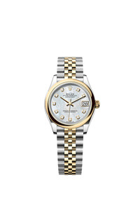 Oyster, 31 mm, Oystersteel and yellow gold Reference278243 Make a date of a day This Oyster PerpetualDatejust 31inOystersteel and yellow goldfeaturesa white mother-of-pearl, diamond-setdial anda Jubileebracelet. Mother-of-Pearl Dial Highlighting natural beauty This dial features diamonds in 18 ct gold settings. Mother-of-pearl is by its nature full of mystery and surprises. Depending on its origin, it can be pink, white, black or yellow. It differs in colour, intensity and structure according to the part of the shell from which it is extracted. At Rolex, mother-of-pearl is never artificially coloured. Instead, particular know-how and skill are devoted to simply highlighting its natural beauty and preserving the original hues. As all mother-of-pearl dials are unique pieces, an identical dial will never be found on another wrist. Yellow Rolesor A meeting of two metals Gold is coveted for its lustre and nobility. Steel reinforces strength and reliability. Together, they harmoniously combine the best of their properties. A true Rolex signature, Rolesor has featured on Rolex models since the early 1930s, and was trademarked as a name in 1933. It is one of the prominent pillars of the Oyster collection. The Jubilee bracelet Supple and comfortable The design, development and production of Rolex bracelets and clasps, as well as the stringent tests they face, involve advanced high technology. And, as with all the components of the watch, aesthetic controls by the human eye guarantee impeccable beauty. The Jubilee, a supple and comfortable five-piece link metal bracelet, was designed and made especially for the launch of the Oyster Perpetual Datejust in 1945.