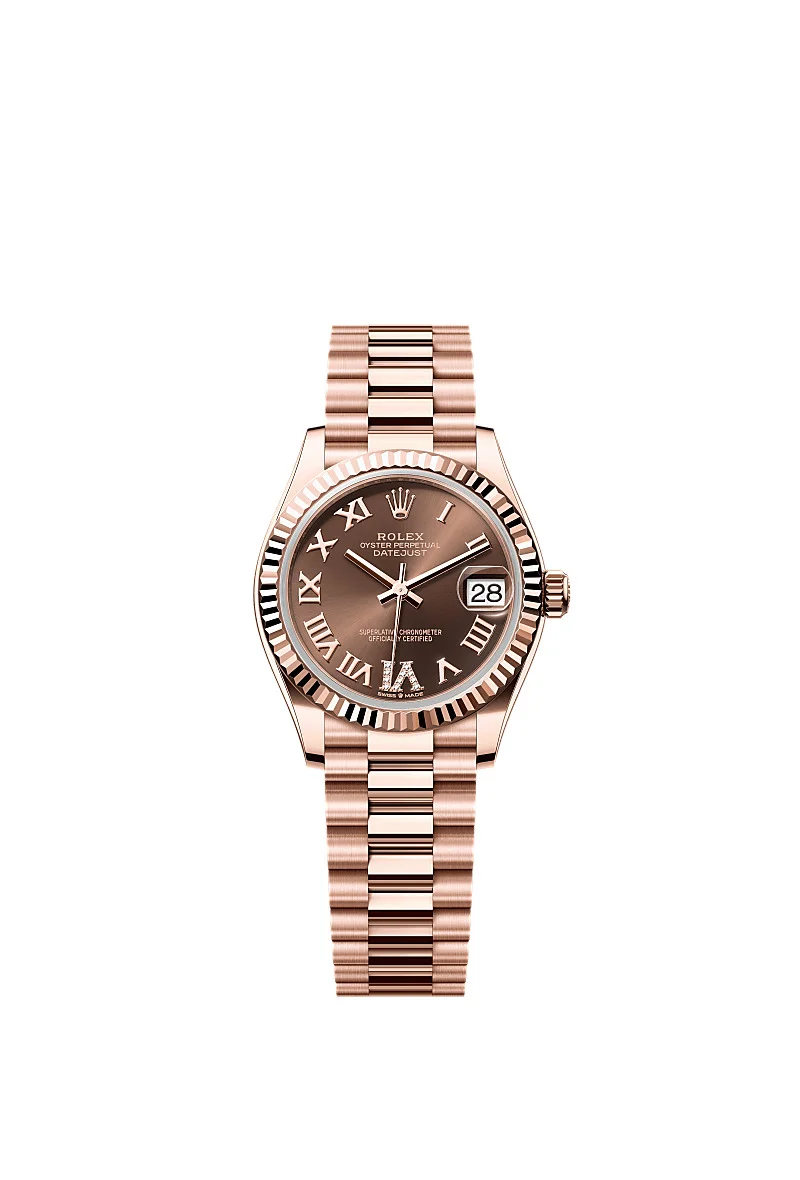 Oyster, 31 mm, Everose gold Reference278275 Make a date of a day This Oyster PerpetualDatejust 31in18 ct Everose goldfeaturesa chocolate, diamond-setdial anda Presidentbracelet. Chocolate Dial A watchmaking technique This dial features a large VI set with 11 diamonds. The sunray finish creates delicate light reflections on many dials in the Oyster Perpetual collection. It is obtained using masterful brushing techniques that create grooves running outwards from the centre of the dial. Light is diffused consistently along each engraving, creating a characteristic subtle glow that moves depending on the position of the wrist. Once the sunray finish has been completed, the dial colour is applied using Physical Vapour Deposition or electroplating. A light coat of varnish gives the dial its final look. Fluted bezel A Rolex signature The Rolex fluted bezel is a mark of distinction. Originally, the fluting of the Oyster bezel had a functional purpose: it served to screw the bezel onto the case helping to ensure the waterproofness of the watch. It was therefore identical to the fluting on the case back, which was also screwed onto the case for waterproofness, using specific Rolex tools. Over time, the fluting became an aesthetic element, a genuine Rolex signature feature. Today the fluted bezel is a mark of distinction, in gold on this Datejust 31. 18 ct Everose gold An exclusive patent To preserve the beauty of its pink gold watches, Rolex created and patented an exclusive 18 ct pink gold alloy cast in its own foundry: Everose gold. Introduced in 2005, 18 ct Everose is used on all Rolex Oyster models in pink gold. The President bracelet The ultimate refinement The design, development and production of Rolex bracelets and clasps, as well as the stringent tests they face, involve advanced high technology. And, as with all the components of the watch, aesthetic controls by the human eye guarantee impeccable beauty. The President bracelet, with its semi-circular three piece links, was created in 1956 for the launch of the Oyster Perpetual Day-Date. It represents the ultimate in refinement and comfort and is always made of carefully selected precious metals.