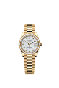 Oyster, 31 mm, yellow gold and diamonds Reference278288RBR Make a date of a day This Oyster PerpetualDatejust 31in18 ct yellow goldfeaturesa white mother-of-pearl, diamond-setdial anda Presidentbracelet. Mother-of-Pearl Dial Highlighting natural beauty This dial features diamonds in 18 ct gold settings. Mother-of-pearl is by its nature full of mystery and surprises. Depending on its origin, it can be pink, white, black or yellow. It differs in colour, intensity and structure according to the part of the shell from which it is extracted. At Rolex, mother-of-pearl is never artificially coloured. Instead, particular know-how and skill are devoted to simply highlighting its natural beauty and preserving the original hues. As all mother-of-pearl dials are unique pieces, an identical dial will never be found on another wrist. Diamond-set bezel A sparkling symphony Gem-setters, like sculptors, finely carve the precious metal to hand-shape the seat in which each gemstone will be perfectly lodged. With the art and craft of a jeweller, the stone is placed and meticulously aligned with the others, then firmly secured in its gold or platinum setting. Besides the intrinsic quality of the stones, several other criteria contribute to the beauty of Rolex gem-setting: the precise alignment of the height of the gems, their orientation and position, the regularity, strength and proportions of the setting as well as the intricate finishing of the metalwork. A sparkling symphony to enhance the watch and enchant the wearer. 18 ct yellow gold Commitment to excellence By operating its own exclusive foundry, Rolex has the unrivalled ability to cast the highest quality 18 ct gold alloys. According to the proportion of silver, copper, platinum or palladium added, different types of 18 ct gold are obtained: yellow, pink or white. They are made with only the purest metals and meticulously inspected in an in-house laboratory with state-of-the-art equipment, before the gold is formed and shaped with the same painstaking attention to quality. Rolex's commitment to excellence begins at the source. The President bracelet The ultimate refinement The design, development and production of Rolex bracelets and clasps, as well as the stringent tests they face, involve advanced high technology. And, as with all the components of the watch, aesthetic controls by the human eye guarantee impeccable beauty. The President bracelet, with its semi-circular three piece links, was created in 1956 for the launch of the Oyster Perpetual Day-Date. It represents the ultimate in refinement and comfort and is always made of carefully selected precious metals.