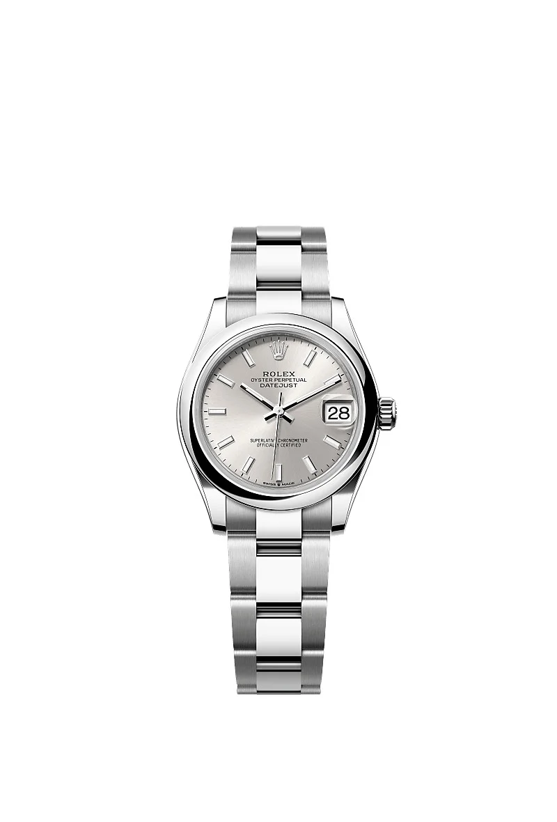 Oyster, 31 mm, Oystersteel Reference278240 Make a date of a day This Oyster PerpetualDatejust 31inOystersteelfeaturesa silverdial andan Oysterbracelet. Silver dial A watchmaking technique The sunray finish creates delicate light reflections on many dials in the Oyster Perpetual collection. It is obtained using masterful brushing techniques that create grooves running outwards from the centre of the dial. Light is diffused consistently along each engraving, creating a characteristic subtle glow that moves depending on the position of the wrist. Once the sunray finish has been completed, the dial colour is applied using Physical Vapour Deposition or electroplating. A light coat of varnish gives the dial its final look. Oystersteel Highly resistant to corrosion Rolex uses Oystersteel for its steel watch cases. Specially developed by the brand, Oystersteel belongs to the 904L steel family, alloys most commonly used in high-technology and in the aerospace and chemical industries, where maximum resistance to corrosion is essential. Oystersteel is extremely resistant, offers an exceptional finish once polished and maintains its beauty even in the harshest environments. The Oyster bracelet Alchemy of form and function The Oyster bracelet is a perfect alchemy of form and function, aesthetics and technology, designed to be both robust and comfortable. It is equipped with an Oysterclasp and the Easylink comfort extension link, also exclusive to Rolex. This ingenious system allows the wearer to increase the bracelet length by approximately 5 mm, providing additional comfort in any circumstance.