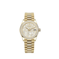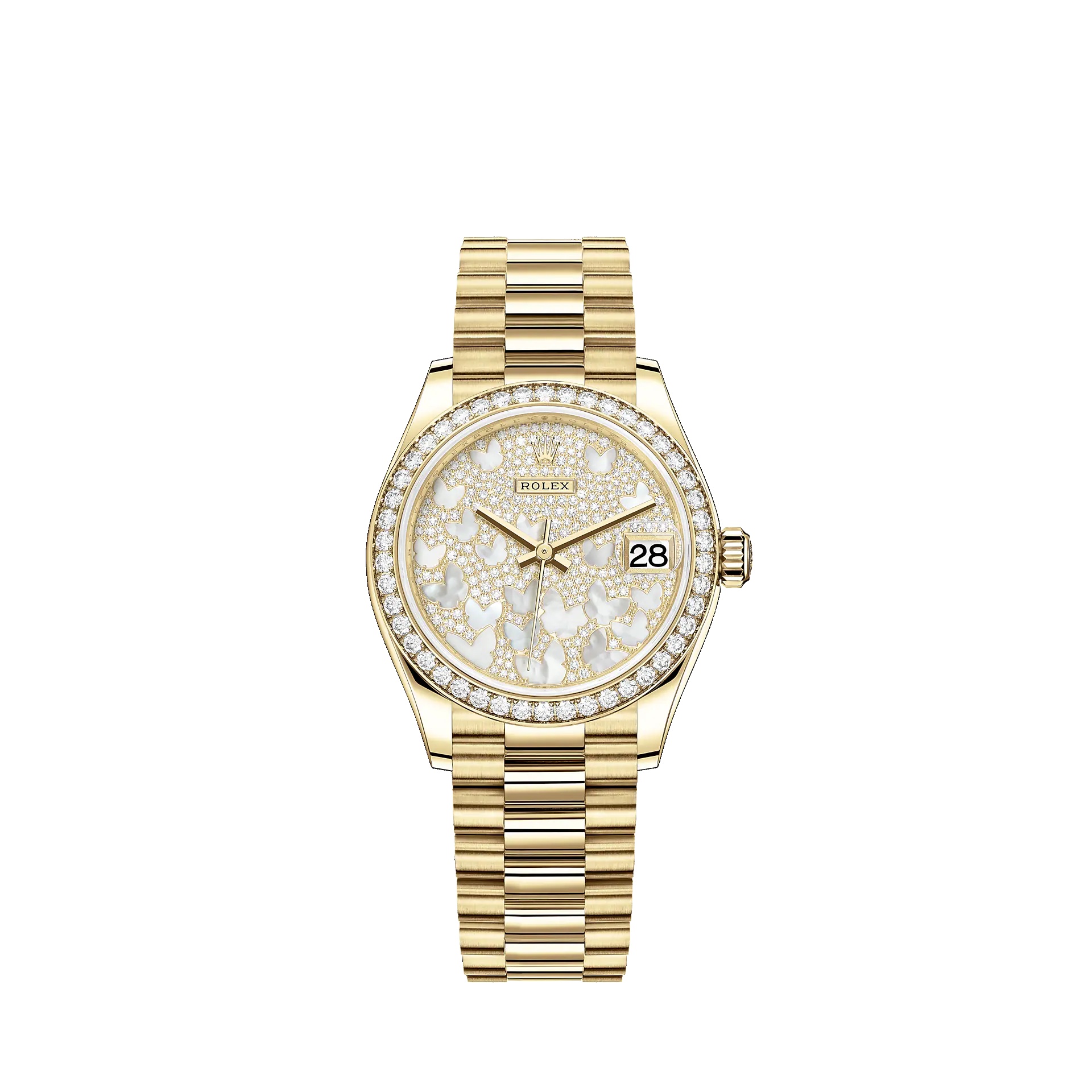 Oyster, 31 mm, yellow gold and diamonds THIS OYSTER PERPETUAL DATEJUST 31 IN 18 CT YELLOW GOLD FEATURES A DIAMOND-PAVED, WITH WHITE MOTHER-OF-PEARL BUTTERFLIES, DIAL AND A PRESIDENT BRACELET. The light reflections on the case sides and lugs highlight the elegant profile of the 31 mm Oyster case, which is fitted with a diamond-set bezel. Aesthetically, the Datejust has spanned eras, while retaining the enduring codes that make it, notably in its traditional versions, one of the most recognized and recognizable of watches. Model features - DIAMOND-SET BEZEL - 18 CT YELLOW GOLD - THE PRESIDENT BRACELET - THE CYCLOPS LENS - 2236 MOVEMENT Specifications Reference 278288RBR