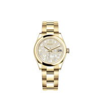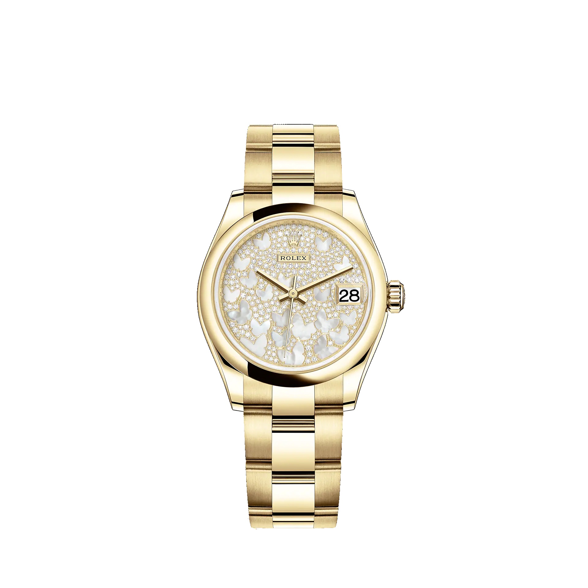 Oyster, 31 mm, yellow gold THIS OYSTER PERPETUAL DATEJUST 31 IN 18 CT YELLOW GOLD FEATURES A DIAMOND-PAVED, WITH WHITE MOTHER-OF-PEARL BUTTERFLIES, DIAL AND AN OYSTER BRACELET. The light reflections on the case sides and lugs highlight the elegant profile of the 31 mm Oyster case, which is fitted with a Domed bezel. Aesthetically, the Datejust has spanned eras, while retaining the enduring codes that make it, notably in its traditional versions, one of the most recognized and recognizable of watches. Model features - 18 CT YELLOW GOLD - THE OYSTER BRACELET - THE CYCLOPS LENS - 2236 MOVEMENT Specifications Reference 278248
