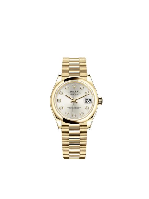 Oyster, 31 mm, yellow gold THIS OYSTER PERPETUAL DATEJUST 31 IN 18 CT YELLOW GOLD FEATURES AN OLIVE GREEN, DIAMOND-SET DIAL AND A PRESIDENT BRACELET. Its dial features Large VI set with diamonds. The light reflections on the case sides and lugs highlight the elegant profile of the 31 mm Oyster case, which is fitted with a Domed bezel. Aesthetically, the Datejust has spanned eras, while retaining the enduring codes that make it, notably in its traditional versions, one of the most recognized and recognizable of watches. Model features - 18 CT YELLOW GOLD - THE PRESIDENT BRACELET - THE CYCLOPS LENS - 2236 MOVEMENT Specifications Reference 278248
