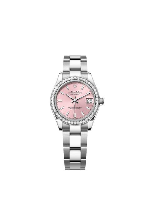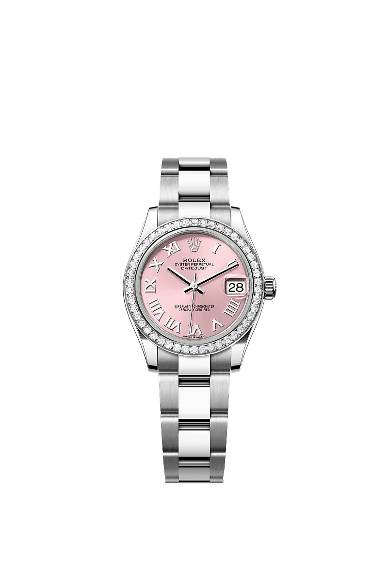 Oyster, 31 mm, Oystersteel, white gold and diamonds Reference278384RBR Make a date of a day This Oyster PerpetualDatejust 31inOystersteel and white goldfeaturesa pinkdial andan Oysterbracelet. Diamond-set bezel A sparkling symphony Gem-setters, like sculptors, finely carve the precious metal to hand-shape the seat in which each gemstone will be perfectly lodged. With the art and craft of a jeweller, the stone is placed and meticulously aligned with the others, then firmly secured in its gold or platinum setting. Besides the intrinsic quality of the stones, several other criteria contribute to the beauty of Rolex gem-setting: the precise alignment of the height of the gems, their orientation and position, the regularity, strength and proportions of the setting as well as the intricate finishing of the metalwork. A sparkling symphony to enhance the watch and enchant the wearer. Pink Dial A watchmaking technique The sunray finish creates delicate light reflections on many dials in the Oyster Perpetual collection. It is obtained using masterful brushing techniques that create grooves running outwards from the centre of the dial. Light is diffused consistently along each engraving, creating a characteristic subtle glow that moves depending on the position of the wrist. Once the sunray finish has been completed, the dial colour is applied using Physical Vapour Deposition or electroplating. A light coat of varnish gives the dial its final look. White Rolesor A meeting of two metals Gold is coveted for its lustre and nobility. Steel reinforces strength and reliability. Together, they harmoniously combine the best of their properties. A true Rolex signature, Rolesor has featured on Rolex models since the early 1930s, and was trademarked as a name in 1933. It is one of the prominent pillars of the Oyster collection. The Oyster bracelet Alchemy of form and function The Oyster bracelet is a perfect alchemy of form and function, aesthetics and technology, designed to be both robust and comfortable. It is equipped with an Oysterclasp and the Easylink comfort extension link, also exclusive to Rolex. This ingenious system allows the wearer to increase the bracelet length by approximately 5 mm, providing additional comfort in any circumstance.