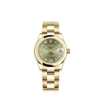 Oyster, 31 mm, yellow gold THIS OYSTER PERPETUAL DATEJUST 31 IN 18 CT YELLOW GOLD FEATURES AN OLIVE GREEN, DIAMOND-SET DIAL AND AN OYSTER BRACELET. Its dial features Large VI set with diamonds. The light reflections on the case sides and lugs highlight the elegant profile of the 31 mm Oyster case, which is fitted with a Domed bezel. Aesthetically, the Datejust has spanned eras, while retaining the enduring codes that make it, notably in its traditional versions, one of the most recognized and recognizable of watches. Model features - 18 CT YELLOW GOLD - THE OYSTER BRACELET - THE CYCLOPS LENS - 2236 MOVEMENT Specifications Reference 278248