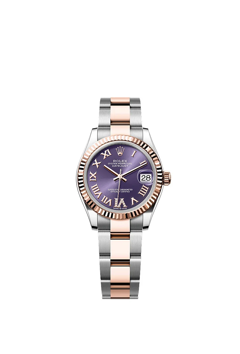 Oyster, 31 mm, Oystersteel and Everose gold Reference278271 Make a date of a day This Oyster PerpetualDatejust 31inOystersteel and Everose goldfeaturesan aubergine, diamond-setdial andan Oysterbracelet. Aubergine Dial A watchmaking technique This dial features a large VI set with 11 diamonds. The sunray finish creates delicate light reflections on many dials in the Oyster Perpetual collection. It is obtained using masterful brushing techniques that create grooves running outwards from the centre of the dial. Light is diffused consistently along each engraving, creating a characteristic subtle glow that moves depending on the position of the wrist. Once the sunray finish has been completed, the dial colour is applied using Physical Vapour Deposition or electroplating. A light coat of varnish gives the dial its final look. Fluted bezel A Rolex signature The Rolex fluted bezel is a mark of distinction. Originally, the fluting of the Oyster bezel had a functional purpose: it served to screw the bezel onto the case helping to ensure the waterproofness of the watch. It was therefore identical to the fluting on the case back, which was also screwed onto the case for waterproofness, using specific Rolex tools. Over time, the fluting became an aesthetic element, a genuine Rolex signature feature. Today the fluted bezel is a mark of distinction, in gold on this Datejust 31. Everose Rolesor A meeting of two metals Gold is coveted for its lustre and nobility. Steel reinforces strength and reliability. Together, they harmoniously combine the best of their properties. A true Rolex signature, Rolesor has featured on Rolex models since the early 1930s, and was trademarked as a name in 1933. It is one of the prominent pillars of the Oyster collection. The Oyster bracelet Alchemy of form and function The Oyster bracelet is a perfect alchemy of form and function, aesthetics and technology, designed to be both robust and comfortable. It is equipped with an Oysterclasp and the Easylink comfort extension link, also exclusive to Rolex. This ingenious system allows the wearer to increase the bracelet length by approximately 5 mm, providing additional comfort in any circumstance.
