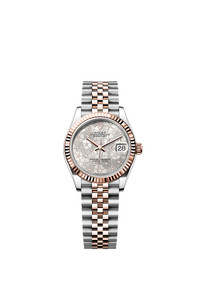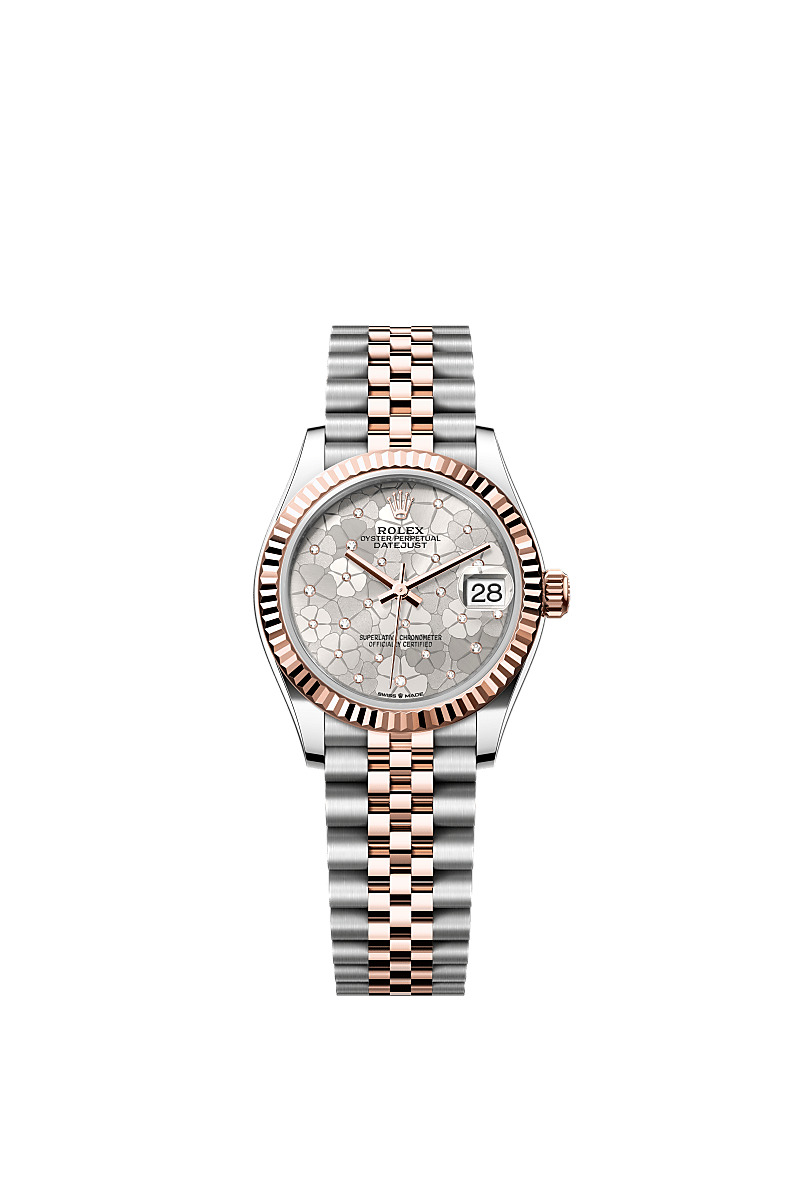Oyster, 31 mm, Oystersteel and Everose gold Reference278271 Make a date of a day This Oyster PerpetualDatejust 31inOystersteel and Everose goldfeaturesa silver floral-motif, diamond-setdial anda Jubileebracelet. Silver dial Floral motif The floral-motif dials combine three different finishes – sunray, matt and grained. High-technology finishing techniques were required to create this motif, a shining example of refined dial-making expertise. The textural effects are further enhanced by 24 diamonds of varying sizes, which illuminate the centre of each flower. Fluted bezel A Rolex signature The Rolex fluted bezel is a mark of distinction. Originally, the fluting of the Oyster bezel had a functional purpose: it served to screw the bezel onto the case helping to ensure the waterproofness of the watch. It was therefore identical to the fluting on the case back, which was also screwed onto the case for waterproofness, using specific Rolex tools. Over time, the fluting became an aesthetic element, a genuine Rolex signature feature. Today the fluted bezel is a mark of distinction, in gold on this Datejust 31. Everose Rolesor A meeting of two metals Gold is coveted for its lustre and nobility. Steel reinforces strength and reliability. Together, they harmoniously combine the best of their properties. A true Rolex signature, Rolesor has featured on Rolex models since the early 1930s, and was trademarked as a name in 1933. It is one of the prominent pillars of the Oyster collection. The Jubilee bracelet Supple and comfortable The design, development and production of Rolex bracelets and clasps, as well as the stringent tests they face, involve advanced high technology. And, as with all the components of the watch, aesthetic controls by the human eye guarantee impeccable beauty. The Jubilee, a supple and comfortable five-piece link metal bracelet, was designed and made especially for the launch of the Oyster Perpetual Datejust in 1945.