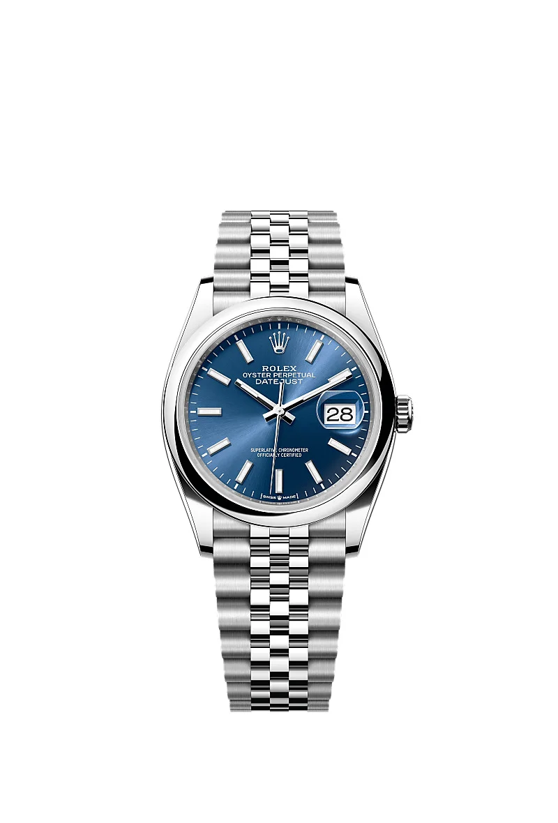 Oyster, 36 mm, Oystersteel Reference126200 Make a date of a day This Oyster PerpetualDatejust 36inOystersteelfeaturesa bright bluedial anda Jubileebracelet. Bright blue dial A watchmaking technique The sunray finish creates delicate light reflections on many dials in the Oyster Perpetual collection. It is obtained using masterful brushing techniques that create grooves running outwards from the centre of the dial. Light is diffused consistently along each engraving, creating a characteristic subtle glow that moves depending on the position of the wrist. Once the sunray finish has been completed, the dial colour is applied using Physical Vapour Deposition or electroplating. A light coat of varnish gives the dial its final look. Oystersteel Highly resistant to corrosion Rolex uses Oystersteel for its steel watch cases. Specially developed by the brand, Oystersteel belongs to the 904L steel family, alloys most commonly used in high-technology and in the aerospace and chemical industries, where maximum resistance to corrosion is essential. Oystersteel is extremely resistant, offers an exceptional finish once polished and maintains its beauty even in the harshest environments. The Jubilee bracelet Supple and comfortable The design, development and production of Rolex bracelets and clasps, as well as the stringent tests they face, involve advanced high technology. And, as with all the components of the watch, aesthetic controls by the human eye guarantee impeccable beauty. The Jubilee, a supple and comfortable five-piece link metal bracelet, was designed and made especially for the launch of the Oyster Perpetual Datejust in 1945.