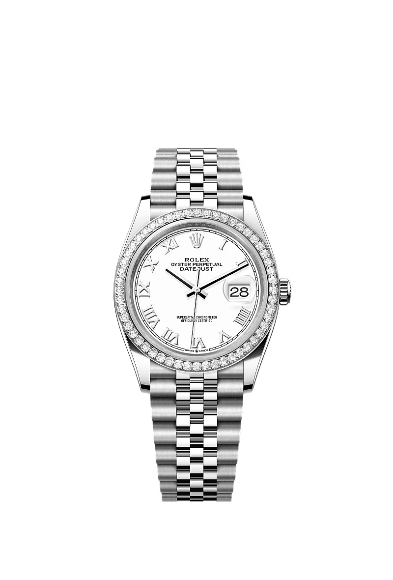 Oyster, 36 mm, Oystersteel, white gold and diamonds Reference126284RBR Make a date of a day This Oyster PerpetualDatejust 36inOystersteel and white goldfeaturesa whitedial anda Jubileebracelet. Diamond-set bezel A sparkling symphony Gem-setters, like sculptors, finely carve the precious metal to hand-shape the seat in which each gemstone will be perfectly lodged. With the art and craft of a jeweller, the stone is placed and meticulously aligned with the others, then firmly secured in its gold or platinum setting. Besides the intrinsic quality of the stones, several other criteria contribute to the beauty of Rolex gem-setting: the precise alignment of the height of the gems, their orientation and position, the regularity, strength and proportions of the setting as well as the intricate finishing of the metalwork. A sparkling symphony to enhance the watch and enchant the wearer. White dial Limitless freedom Lacquer combines almost limitless freedom of colour with intensity and a smooth finish. The lacquering technique consists of successively depositing six thin layers of lacquer on a brass base plate. A colourless varnish is then applied to give the colour or shade all of its depth and shine. Once the varnish is dry, the surface of the dial is polished to magnify the colour; the dial is then ready to be pad printed and receive its appliques. White Rolesor A meeting of two metals Gold is coveted for its lustre and nobility. Steel reinforces strength and reliability. Together, they harmoniously combine the best of their properties. A true Rolex signature, Rolesor has featured on Rolex models since the early 1930s, and was trademarked as a name in 1933. It is one of the prominent pillars of the Oyster collection. The Jubilee bracelet Supple and comfortable The design, development and production of Rolex bracelets and clasps, as well as the stringent tests they face, involve advanced high technology. And, as with all the components of the watch, aesthetic controls by the human eye guarantee impeccable beauty. The Jubilee, a supple and comfortable five-piece link metal bracelet, was designed and made especially for the launch of the Oyster Perpetual Datejust in 1945.