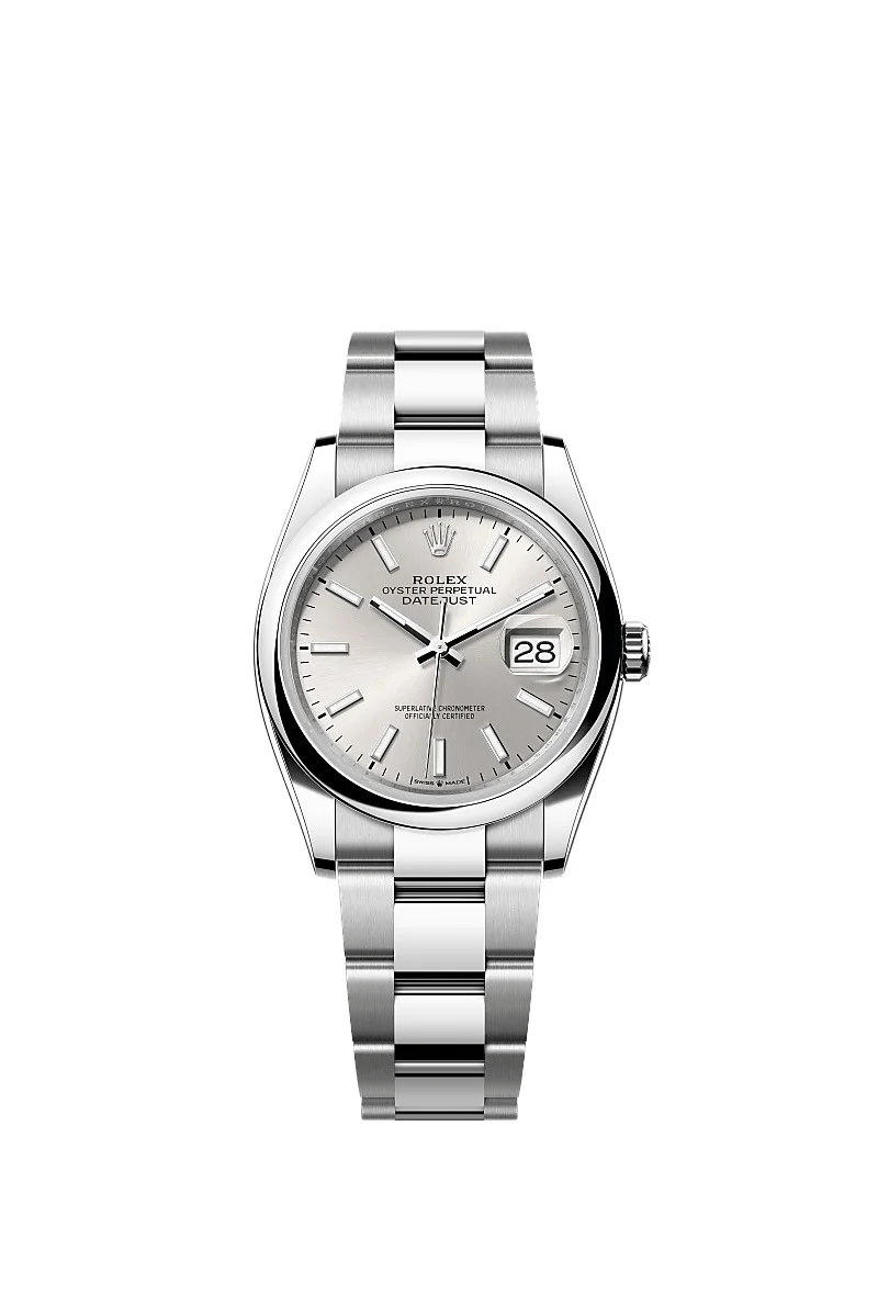 Oyster, 36 mm, Oystersteel Reference126200 Make a date of a day This Oyster PerpetualDatejust 36inOystersteelfeaturesa silverdial andan Oysterbracelet. Silver dial A watchmaking technique The sunray finish creates delicate light reflections on many dials in the Oyster Perpetual collection. It is obtained using masterful brushing techniques that create grooves running outwards from the centre of the dial. Light is diffused consistently along each engraving, creating a characteristic subtle glow that moves depending on the position of the wrist. Once the sunray finish has been completed, the dial colour is applied using Physical Vapour Deposition or electroplating. A light coat of varnish gives the dial its final look. Oystersteel Highly resistant to corrosion Rolex uses Oystersteel for its steel watch cases. Specially developed by the brand, Oystersteel belongs to the 904L steel family, alloys most commonly used in high-technology and in the aerospace and chemical industries, where maximum resistance to corrosion is essential. Oystersteel is extremely resistant, offers an exceptional finish once polished and maintains its beauty even in the harshest environments. The Oyster bracelet Alchemy of form and function The Oyster bracelet is a perfect alchemy of form and function, aesthetics and technology, designed to be both robust and comfortable. It is equipped with an Oysterclasp and the Easylink comfort extension link, also exclusive to Rolex. This ingenious system allows the wearer to increase the bracelet length by approximately 5 mm, providing additional comfort in any circumstance.