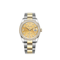 THIS OYSTER PERPETUAL DATEJUST 36 IN OYSTERSTEEL AND YELLOW GOLD FEATURES A CHAMPAGNE-COLOUR JUBILEE DESIGN, DIAMOND-SET DIAL AND AN OYSTER BRACELET. Its dial features diamonds in 18 ct gold settings. The light reflections on the case sides and lugs highlight the elegant profile of the 36 mm Oyster case, which is fitted with a diamond-set bezel. Aesthetically, the Datejust has spanned eras, while retaining the enduring codes that make it, notably in its traditional versions, one of the most recognized and recognizable of watches. Model features Specifications Reference 126283RBR
