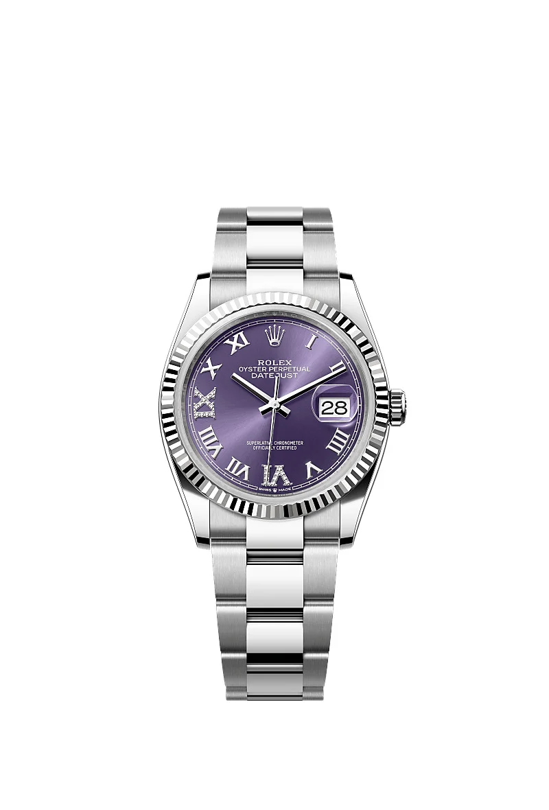 Oyster, 36 mm, Oystersteel and white gold Reference126234 Make a date of a day This Oyster PerpetualDatejust 36inOystersteel and white goldfeaturesan aubergine, diamond-setdial andan Oysterbracelet. Aubergine Dial A watchmaking technique This dial features a Roman VI and IX in 18 ct gold, set with 24 diamonds. The sunray finish creates delicate light reflections on many dials in the Oyster Perpetual collection. It is obtained using masterful brushing techniques that create grooves running outwards from the centre of the dial. Light is diffused consistently along each engraving, creating a characteristic subtle glow that moves depending on the position of the wrist. Once the sunray finish has been completed, the dial colour is applied using Physical Vapour Deposition or electroplating. A light coat of varnish gives the dial its final look. Fluted bezel A Rolex signature The Rolex fluted bezel is a mark of distinction. Originally, the fluting of the Oyster bezel had a functional purpose: it served to screw the bezel onto the case helping to ensure the waterproofness of the watch. It was therefore identical to the fluting on the case back, which was also screwed onto the case for waterproofness, using specific Rolex tools. Over time, the fluting became an aesthetic element, a genuine Rolex signature feature. Today the fluted bezel is a mark of distinction, in gold on this Datejust 36. White Rolesor A meeting of two metals Gold is coveted for its lustre and nobility. Steel reinforces strength and reliability. Together, they harmoniously combine the best of their properties. A true Rolex signature, Rolesor has featured on Rolex models since the early 1930s, and was trademarked as a name in 1933. It is one of the prominent pillars of the Oyster collection. The Oyster bracelet Alchemy of form and function The Oyster bracelet is a perfect alchemy of form and function, aesthetics and technology, designed to be both robust and comfortable. It is equipped with an Oysterclasp and the Easylink comfort extension link, also exclusive to Rolex. This ingenious system allows the wearer to increase the bracelet length by approximately 5 mm, providing additional comfort in any circumstance.