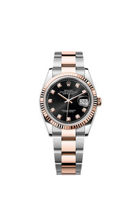 Oyster, 36 mm, Oystersteel and Everose gold Reference126231 Make a date of a day This Oyster PerpetualDatejust 36inOystersteel and Everose goldfeaturesa bright black, diamond-setdial andan Oysterbracelet. Bright black dial A watchmaking technique The sunray finish creates delicate light reflections on many dials in the Oyster Perpetual collection. It is obtained using masterful brushing techniques that create grooves running outwards from the centre of the dial. Light is diffused consistently along each engraving, creating a characteristic subtle glow that moves depending on the position of the wrist. Once the sunray finish has been completed, the dial colour is applied using Physical Vapour Deposition or electroplating. A light coat of varnish gives the dial its final look. Fluted bezel A Rolex signature The Rolex fluted bezel is a mark of distinction. Originally, the fluting of the Oyster bezel had a functional purpose: it served to screw the bezel onto the case helping to ensure the waterproofness of the watch. It was therefore identical to the fluting on the case back, which was also screwed onto the case for waterproofness, using specific Rolex tools. Over time, the fluting became an aesthetic element, a genuine Rolex signature feature. Today the fluted bezel is a mark of distinction, in gold on this Datejust 36. Everose Rolesor A meeting of two metals Gold is coveted for its lustre and nobility. Steel reinforces strength and reliability. Together, they harmoniously combine the best of their properties. A true Rolex signature, Rolesor has featured on Rolex models since the early 1930s, and was trademarked as a name in 1933. It is one of the prominent pillars of the Oyster collection. The Oyster bracelet Alchemy of form and function The Oyster bracelet is a perfect alchemy of form and function, aesthetics and technology, designed to be both robust and comfortable. It is equipped with an Oysterclasp and the Easylink comfort extension link, also exclusive to Rolex. This ingenious system allows the wearer to increase the bracelet length by approximately 5 mm, providing additional comfort in any circumstance.