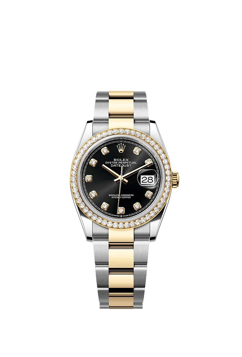 Oyster, 36 mm, Oystersteel, yellow gold and diamonds Reference126283RBR Make a date of a day This Oyster PerpetualDatejust 36inOystersteel and yellow goldfeaturesa bright black, diamond-setdial andan Oysterbracelet. Bright black dial A watchmaking technique The sunray finish creates delicate light reflections on many dials in the Oyster Perpetual collection. It is obtained using masterful brushing techniques that create grooves running outwards from the centre of the dial. Light is diffused consistently along each engraving, creating a characteristic subtle glow that moves depending on the position of the wrist. Once the sunray finish has been completed, the dial colour is applied using Physical Vapour Deposition or electroplating. A light coat of varnish gives the dial its final look. Diamond-set bezel A sparkling symphony Gem-setters, like sculptors, finely carve the precious metal to hand-shape the seat in which each gemstone will be perfectly lodged. With the art and craft of a jeweller, the stone is placed and meticulously aligned with the others, then firmly secured in its gold or platinum setting. Besides the intrinsic quality of the stones, several other criteria contribute to the beauty of Rolex gem-setting: the precise alignment of the height of the gems, their orientation and position, the regularity, strength and proportions of the setting as well as the intricate finishing of the metalwork. A sparkling symphony to enhance the watch and enchant the wearer. Yellow Rolesor A meeting of two metals Gold is coveted for its lustre and nobility. Steel reinforces strength and reliability. Together, they harmoniously combine the best of their properties. A true Rolex signature, Rolesor has featured on Rolex models since the early 1930s, and was trademarked as a name in 1933. It is one of the prominent pillars of the Oyster collection. The Oyster bracelet Alchemy of form and function The Oyster bracelet is a perfect alchemy of form and function, aesthetics and technology, designed to be both robust and comfortable. It is equipped with an Oysterclasp and the Easylink comfort extension link, also exclusive to Rolex. This ingenious system allows the wearer to increase the bracelet length by approximately 5 mm, providing additional comfort in any circumstance.