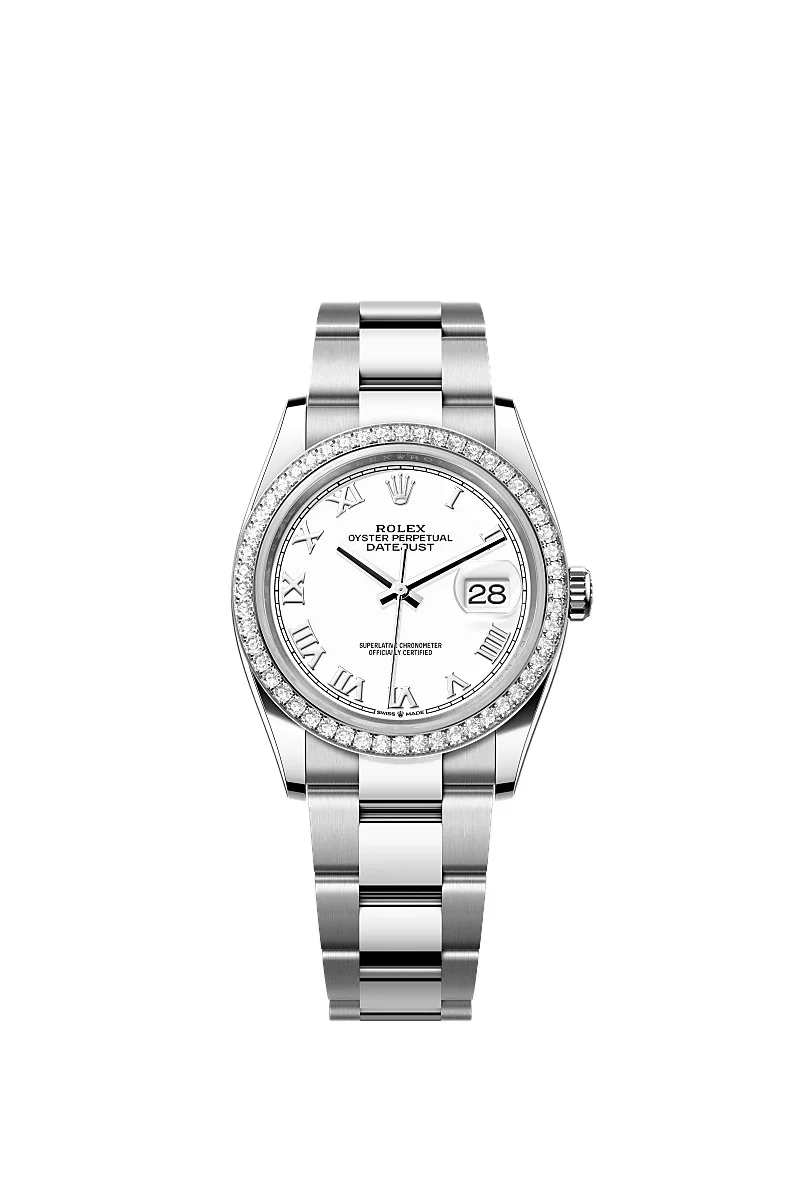 Oyster, 36 mm, Oystersteel, white gold and diamonds Reference126284RBR Make a date of a day This Oyster PerpetualDatejust 36inOystersteel and white goldfeaturesa whitedial andan Oysterbracelet. Diamond-set bezel A sparkling symphony Gem-setters, like sculptors, finely carve the precious metal to hand-shape the seat in which each gemstone will be perfectly lodged. With the art and craft of a jeweller, the stone is placed and meticulously aligned with the others, then firmly secured in its gold or platinum setting. Besides the intrinsic quality of the stones, several other criteria contribute to the beauty of Rolex gem-setting: the precise alignment of the height of the gems, their orientation and position, the regularity, strength and proportions of the setting as well as the intricate finishing of the metalwork. A sparkling symphony to enhance the watch and enchant the wearer. White dial Limitless freedom Lacquer combines almost limitless freedom of colour with intensity and a smooth finish. The lacquering technique consists of successively depositing six thin layers of lacquer on a brass base plate. A colourless varnish is then applied to give the colour or shade all of its depth and shine. Once the varnish is dry, the surface of the dial is polished to magnify the colour; the dial is then ready to be pad printed and receive its appliques. White Rolesor A meeting of two metals Gold is coveted for its lustre and nobility. Steel reinforces strength and reliability. Together, they harmoniously combine the best of their properties. A true Rolex signature, Rolesor has featured on Rolex models since the early 1930s, and was trademarked as a name in 1933. It is one of the prominent pillars of the Oyster collection. The Oyster bracelet Alchemy of form and function The Oyster bracelet is a perfect alchemy of form and function, aesthetics and technology, designed to be both robust and comfortable. It is equipped with an Oysterclasp and the Easylink comfort extension link, also exclusive to Rolex. This ingenious system allows the wearer to increase the bracelet length by approximately 5 mm, providing additional comfort in any circumstance.