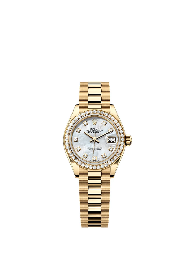 Oyster, 28 mm, yellow gold and diamonds Reference279138RBR Graceful elegance This Oyster PerpetualLady-Datejustin18 ct yellow goldfeaturesa white mother-of-pearl, diamond-setdial anda Presidentbracelet. Mother-of-Pearl Dial Highlighting natural beauty This dial features diamonds in 18 ct gold settings. Mother-of-pearl is by its nature full of mystery and surprises. Depending on its origin, it can be pink, white, black or yellow. It differs in colour, intensity and structure according to the part of the shell from which it is extracted. At Rolex, mother-of-pearl is never artificially coloured. Instead, particular know-how and skill are devoted to simply highlighting its natural beauty and preserving the original hues. As all mother-of-pearl dials are unique pieces, an identical dial will never be found on another wrist. Diamond-set bezel A sparkling symphony Gem-setters, like sculptors, finely carve the precious metal to hand-shape the seat in which each gemstone will be perfectly lodged. With the art and craft of a jeweller, the stone is placed and meticulously aligned with the others, then firmly secured in its gold or platinum setting. Besides the intrinsic quality of the stones, several other criteria contribute to the beauty of Rolex gem-setting: the precise alignment of the height of the gems, their orientation and position, the regularity, strength and proportions of the setting as well as the intricate finishing of the metalwork. A sparkling symphony to enhance the watch and enchant the wearer. 18 ct yellow gold Commitment to excellence By operating its own exclusive foundry, Rolex has the unrivalled ability to cast the highest quality 18 ct gold alloys. According to the proportion of silver, copper, platinum or palladium added, different types of 18 ct gold are obtained: yellow, pink or white. They are made with only the purest metals and meticulously inspected in an in-house laboratory with state-of-the-art equipment, before the gold is formed and shaped with the same painstaking attention to quality. Rolex's commitment to excellence begins at the source. The President bracelet The ultimate refinement This Lady-Datejust is offered on a prestigious President bracelet. Always in solid gold or platinum, the bracelets benefit from a concealed attachment beneath the bezel which ensures seamless visual continuity between the bracelet and case. A new-generation concealed Crownclasp, opened with a hinged Rolex crown, adds the final aesthetic and functional touch to these sumptuous bracelets.