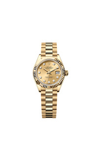 Oyster, 28 mm, yellow gold Reference279178 Graceful elegance This Oyster PerpetualLady-Datejustin18 ct yellow goldfeaturesa champagne colour, diamond-setdial anda Presidentbracelet. Champagne-colour dial A watchmaking technique This dial features diamonds in 18 ct gold settings. The sunray finish creates delicate light reflections on many dials in the Oyster Perpetual collection. It is obtained using masterful brushing techniques that create grooves running outwards from the centre of the dial. Light is diffused consistently along each engraving, creating a characteristic subtle glow that moves depending on the position of the wrist. Once the sunray finish has been completed, the dial colour is applied using Physical Vapour Deposition or electroplating. A light coat of varnish gives the dial its final look. Fluted bezel A Rolex signature The Rolex fluted bezel is a mark of distinction. Originally, the fluting of the Oyster bezel had a functional purpose: it served to screw the bezel onto the case helping to ensure the waterproofness of the watch. It was therefore identical to the fluting on the case back, which was also screwed onto the case for waterproofness, using specific Rolex tools. Over time, the fluting became an aesthetic element, a genuine Rolex signature feature. Today the fluted bezel is a mark of distinction, in gold on this Lady-Datejust. 18 ct yellow gold Commitment to excellence By operating its own exclusive foundry, Rolex has the unrivalled ability to cast the highest quality 18 ct gold alloys. According to the proportion of silver, copper, platinum or palladium added, different types of 18 ct gold are obtained: yellow, pink or white. They are made with only the purest metals and meticulously inspected in an in-house laboratory with state-of-the-art equipment, before the gold is formed and shaped with the same painstaking attention to quality. Rolex's commitment to excellence begins at the source. The President bracelet The ultimate refinement This Lady-Datejust is offered on a prestigious President bracelet. Always in solid gold or platinum, the bracelets benefit from a concealed attachment beneath the bezel which ensures seamless visual continuity between the bracelet and case. A new-generation concealed Crownclasp, opened with a hinged Rolex crown, adds the final aesthetic and functional touch to these sumptuous bracelets.